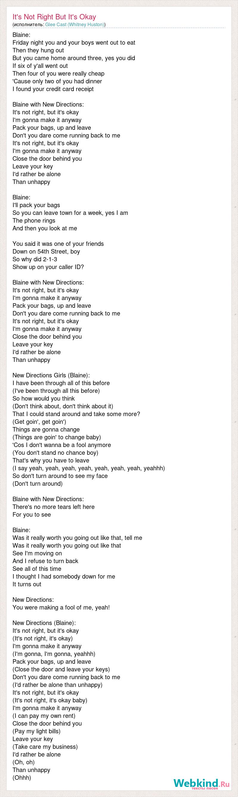 Blaine: Friday night you and your boys went out to eat Then they hung out But you came home around three, yes you did If six of y'all went out Then four of you were really cheap 'Cause only two of you had dinner I found your credit card receipt Blaine with New Directions: It's not right, but it's okay I'm gonna make it anyway Pack your bags, up and leave Don't you dare come running back to me It's not right, but it's okay I'm gonna make it anyway Close the door behind you Leave your key I'd rather be alone Than unhappy Blaine: I'll pack your bags So you can leave town for a week, yes I am The phone rings And then you look at me You said it was one of your friends Down on 54th Street, boy So why did 2-1-3 Show up on your caller ID? Blaine with New Directions: It's not right, but it's okay I'm gonna make it anyway Pack your bags, up and leave Don't you dare come running back to me It's not right, but it's okay I'm gonna make it anyway Close the door behind you Leave your key I'd rather be alone Than unhappy New Directions Girls (Blaine): I have been through all of this before (I've been through all this before) So how would you think (Don't think about, don't think about it) That I could stand around and take some more? (Get goin', get goin') Things are gonna change (Things are goin' to change baby) 'Cos I don't wanna be a fool anymore (You don't stand no chance boy) That's why you have to leave (I say yeah, yeah, yeah, yeah, yeah, yeah, yeah, yeahhh) So don't turn around to see my face (Don't turn around) Blaine with New Directions: There's no more tears left here For you to see Blaine: Was it really worth you going out like that, tell me Was it really worth you going out like that See I'm moving on And I refuse to turn back See all of this time I thought I had somebody down for me It turns out New Directions: You were making a fool of me, yeah! New Directions (Blaine): It's not right, but it's okay (It's not right, it's okay) I'm gonna make it anyway (I'm gonna, I'm gonna, yeahhh) Pack your bags, up and leave (Close the door and leave your keys) Don't you dare come running back to me (I'd rather be alone than unhappy) It's not right, but it's okay (It's not right, it's okay baby) I'm gonna make it anyway (I can pay my own rent) Close the door behind you (Pay my light bills) Leave your key (Take care my business) I'd rather be alone (Oh, oh) Than unhappy (Ohhh)
