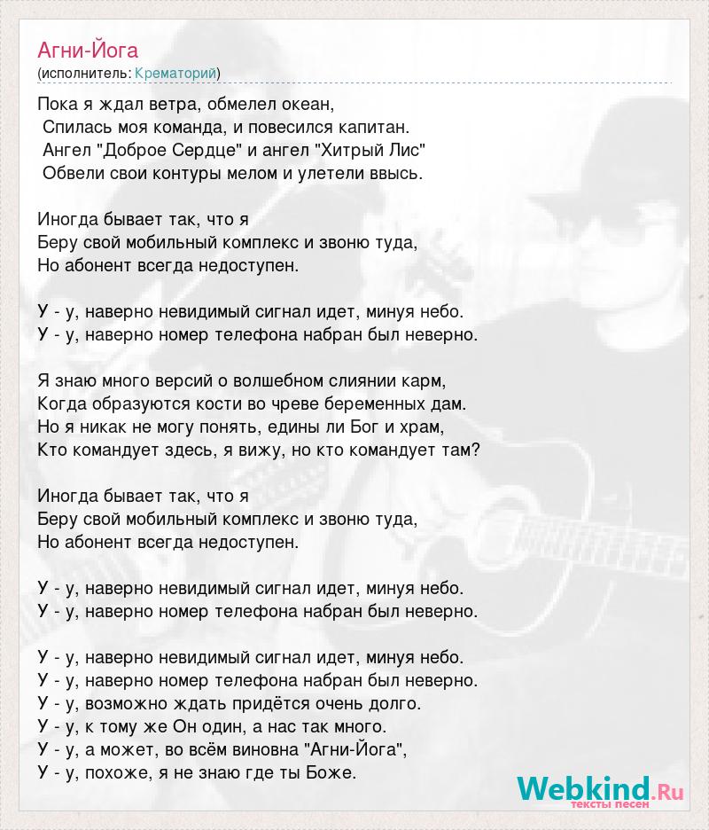 Пока я ждал ветра, обмелел океан, Спилась моя команда, и повесился капитан. Ангел "Доброе Сердце" и ангел "Хитрый Лис" Обвели свои контуры мелом и улетели ввысь. Иногда бывает так, что я Беру свой мобильный комплекс и звоню туда, Но абонент всегда недоступен. У - у, наверно невидимый сигнал идет, минуя небо. У - у, наверно номер телефона набран был неверно. Я знаю много версий о волшебном слиянии карм, Когда образуются кости во чреве беременных дам. Но я никак не могу понять, едины ли Бог и храм, Кто командует здесь, я вижу, но кто командует там? Иногда бывает так, что я Беру свой мобильный комплекс и звоню туда, Но абонент всегда недоступен. У - у, наверно невидимый сигнал идет, минуя небо. У - у, наверно номер телефона набран был неверно. У - у, наверно невидимый сигнал идет, минуя небо. У - у, наверно номер телефона набран был неверно. У - у, возможно ждать придётся очень долго. У - у, к тому же Он один, а нас так много. У - у, а может, во всём виновна "Агни-Йога", У - у, похоже, я не знаю где ты Боже.