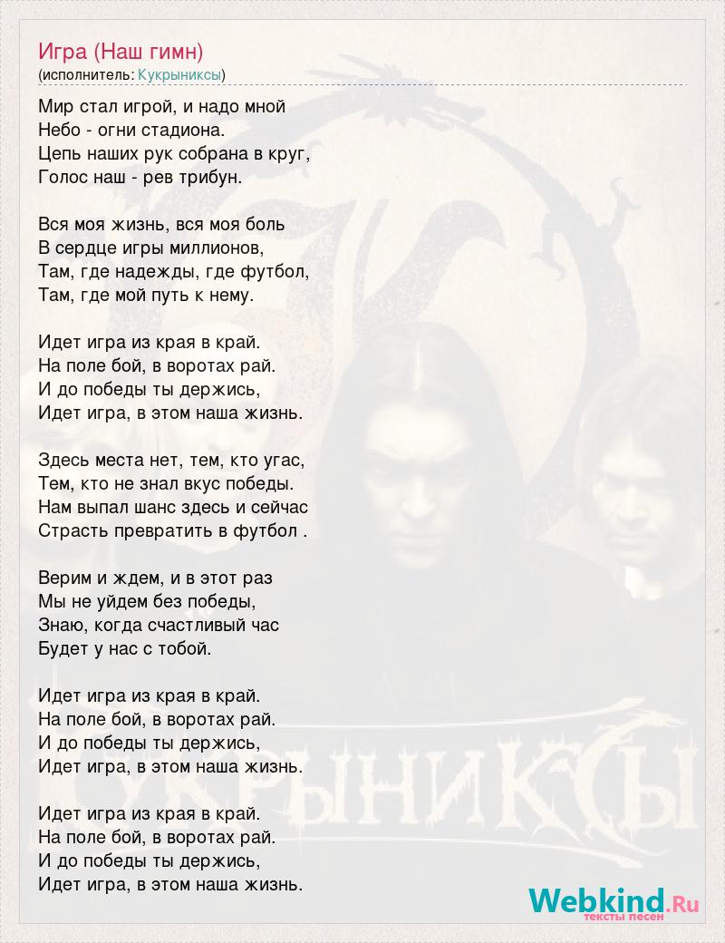 Мир стал игрой, и надо мной Небо - огни стадиона. Цепь наших рук собрана в круг, Голос наш - рев трибун. Вся моя жизнь, вся моя боль В сердце игры миллионов, Там, где надежды, где футбол, Там, где мой путь к нему. Идет игра из края в край. На поле бой, в воротах рай. И до победы ты держись, Идет игра, в этом наша жизнь. Здесь места нет, тем, кто угас, Тем, кто не знал вкус победы. Нам выпал шанс здесь и сейчас Страсть превратить в футбол . Верим и ждем, и в этот раз Мы не уйдем без победы, Знаю, когда счастливый час Будет у нас с тобой. Идет игра из края в край. На поле бой, в воротах рай. И до победы ты держись, Идет игра, в этом наша жизнь. Идет игра из края в край. На поле бой, в воротах рай. И до победы ты держись, Идет игра, в этом наша жизнь.