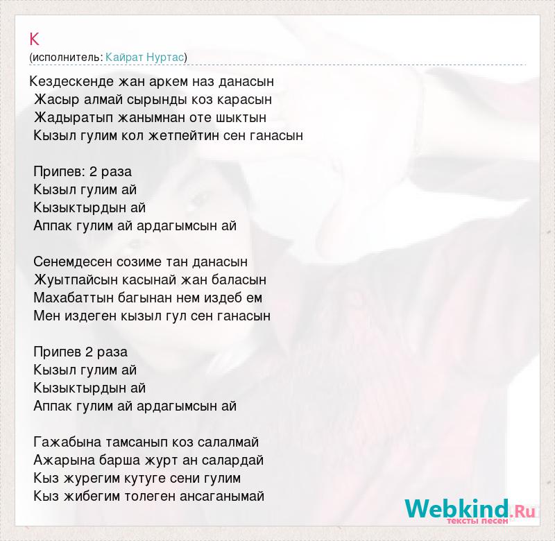 Кездескенде жан аркем наз данасын Жасыр алмай сырынды коз карасын Жадыратып жанымнан оте шыктын Кызыл гулим кол жетпейтин сен ганасын Припев: 2 раза Кызыл гулим ай Кызыктырдын ай Аппак гулим ай ардагымсын ай Сенемдесен созиме тан данасын Жуытпайсын касынай жан баласын Махабаттын багынан нем издеб ем Мен издеген кызыл гул сен ганасын Припев 2 раза Кызыл гулим ай Кызыктырдын ай Аппак гулим ай ардагымсын ай Гажабына тамсанып коз салалмай Ажарына барша журт ан салардай Кыз журегим кутуге сени гулим Кыз жибегим толеген ансаганымай