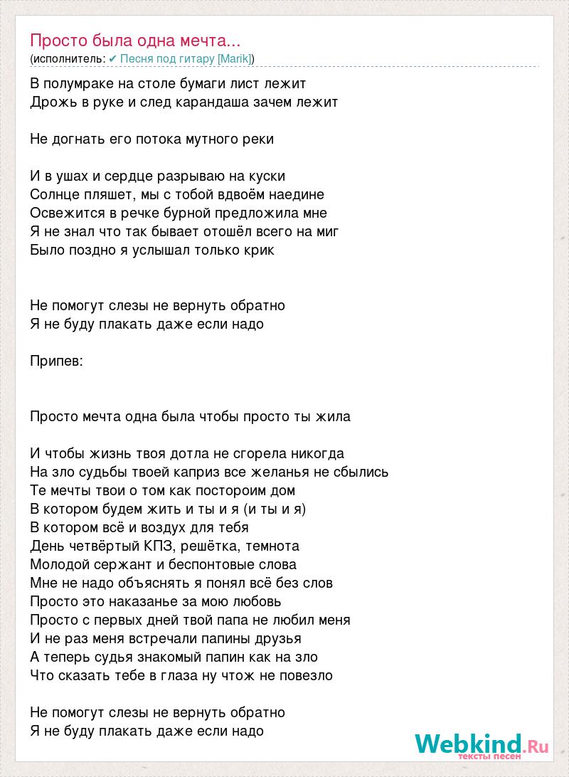 В полумраке на столе бумаги лист лежит Дрожь в руке и след карандаша зачем лежит Не догнать его потока мутного реки И в ушах и сердце разрываю на куски Солнце пляшет, мы с тобой вдвоём наедине Освежится в речке бурной предложила мне Я не знал что так бывает отошёл всего на миг Было поздно я услышал только крик Не помогут слезы не вернуть обратно Я не буду плакать даже если надо Припев: Просто мечта одна была чтобы просто ты жила И чтобы жизнь твоя дотла не сгорела никогда На зло судьбы твоей каприз все желанья не сбылись Те мечты твои о том как постороим дом В котором будем жить и ты и я (и ты и я) В котором всё и воздух для тебя День четвёртый КПЗ, решётка, темнота Молодой сержант и беспонтовые слова Мне не надо объяснять я понял всё без слов Просто это наказанье за мою любовь Просто с первых дней твой папа не любил меня И не раз меня встречали папины друзья А теперь судья знакомый папин как на зло Что сказать тебе в глаза ну чтож не повезло Не помогут слезы не вернуть обратно Я не буду плакать даже если надо