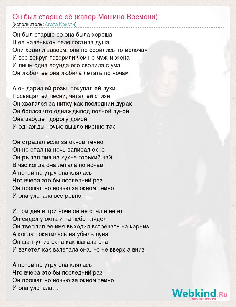 Он был старше ее она была хороша В ее маленьком теле гостила душа Они ходили вдвоем, они не сорились то мелочам И все вокруг говорили чем не муж и жена И лишь одна ерунда его сводила с ума Он любил ее она любила летать по ночам А он дарил ей розы, покупал ей духи Посвящал ей песни, читал ей стихи Он хватался за нитку как последний дурак Он боялся что однаждыпод полной луной Она забудет дорогу домой И однажды ночью вышло именно так Он страдал если за окном темно Он не спал на ночь запирал окно Он рыдал пил на кухне горький чай В час когда она летала по ночам А потом по утру она клялась Что вчера это бы последний раз Он прощал но ночью за окном темно И она улетала все ровно И три дня и три ночи он не спал и не ел Он сидел у окна и на небо глядел Он твердил ее имя выходил встречать на карниз А когда покатилась на убыль луна Он шагнул из окна как шагала она И взлетел как взлетала она, но не вверх а вниз А потом по утру она клялась Что вчера это бы последний раз Он прощал но ночью за окном темно И она улетала…