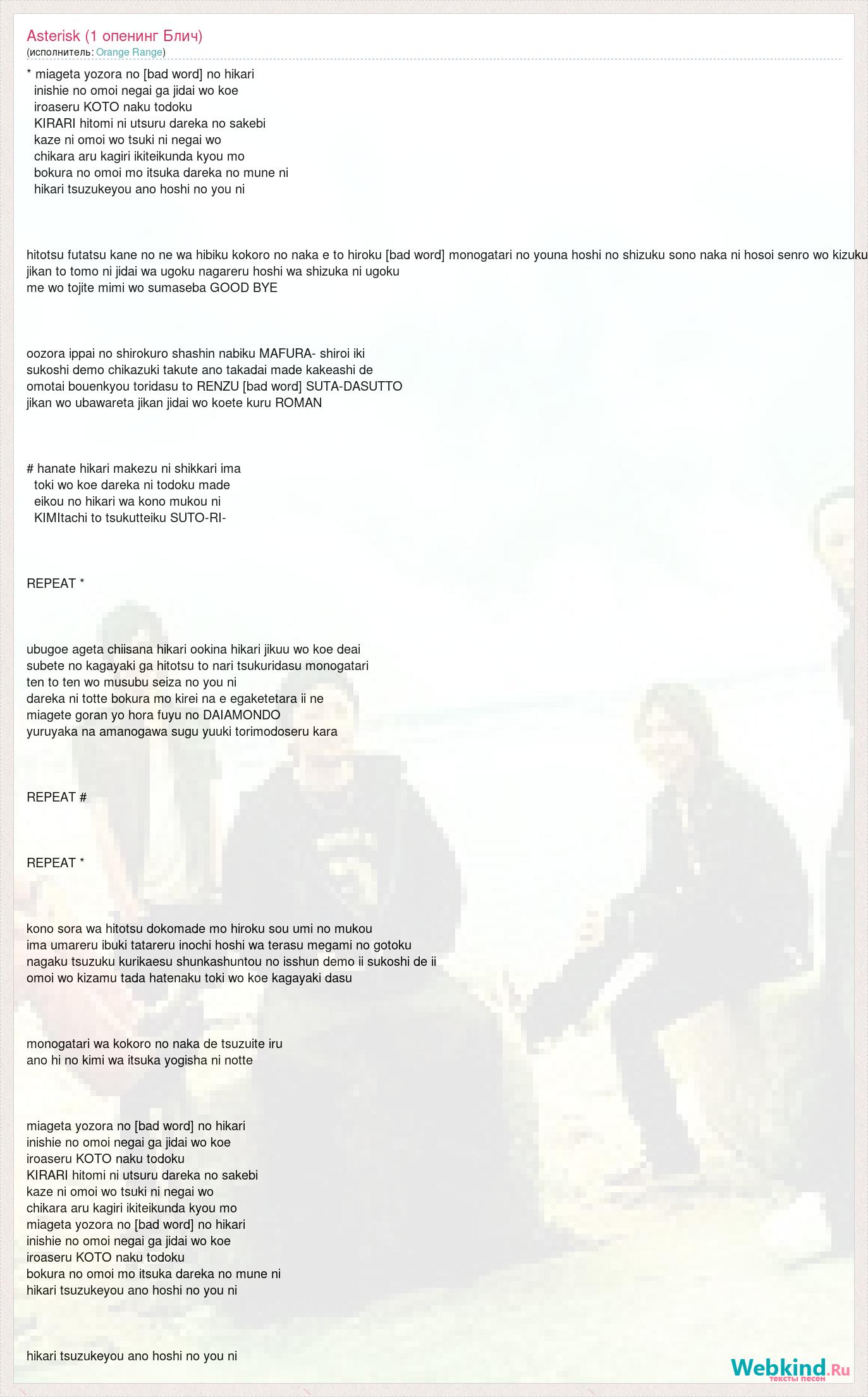 * miageta yozora no [bad word] no hikari inishie no omoi negai ga jidai wo koe iroaseru KOTO naku todoku KIRARI hitomi ni utsuru dareka no sakebi kaze ni omoi wo tsuki ni negai wo chikara aru kagiri ikiteikunda kyou mo bokura no omoi mo itsuka dareka no mune ni hikari tsuzukeyou ano hoshi no you ni hitotsu futatsu kane no ne wa hibiku kokoro no naka e to hiroku [bad word] monogatari no youna hoshi no shizuku sono naka ni hosoi senro wo kizuku jikan to tomo ni jidai wa ugoku nagareru hoshi wa shizuka ni ugoku me wo tojite mimi wo sumaseba GOOD BYE oozora ippai no shirokuro shashin nabiku MAFURA- shiroi iki sukoshi demo chikazuki takute ano takadai made kakeashi de omotai bouenkyou toridasu to RENZU [bad word] SUTA-DASUTTO jikan wo ubawareta jikan jidai wo koete kuru ROMAN # hanate hikari makezu ni shikkari ima toki wo koe dareka ni todoku made eikou no hikari wa kono mukou ni KIMItachi to tsukutteiku SUTO-RI- REPEAT * ubugoe ageta chiisana hikari ookina hikari jikuu wo koe deai subete no kagayaki ga hitotsu to nari tsukuridasu monogatari ten to ten wo musubu seiza no you ni dareka ni totte bokura mo kirei na e egaketetara ii ne miagete goran yo hora fuyu no DAIAMONDO yuruyaka na amanogawa sugu yuuki torimodoseru kara REPEAT # REPEAT * kono sora wa hitotsu dokomade mo hiroku sou umi no mukou ima umareru ibuki tatareru inochi hoshi wa terasu megami no gotoku nagaku tsuzuku kurikaesu shunkashuntou no isshun demo ii sukoshi de ii omoi wo kizamu tada hatenaku toki wo koe kagayaki dasu monogatari wa kokoro no naka de tsuzuite iru ano hi no kimi wa itsuka yogisha ni notte miageta yozora no [bad word] no hikari inishie no omoi negai ga jidai wo koe iroaseru KOTO naku todoku KIRARI hitomi ni utsuru dareka no sakebi kaze ni omoi wo tsuki ni negai wo chikara aru kagiri ikiteikunda kyou mo miageta yozora no [bad word] no hikari inishie no omoi negai ga jidai wo koe iroaseru KOTO naku todoku bokura no omoi mo itsuka dareka no mune ni hikari tsuzukeyou ano hoshi no you ni hikari tsuzukeyou ano hoshi no you ni