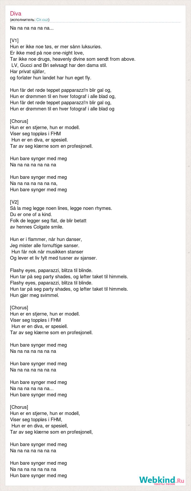 Na na na na na na... [V1] Hun er ikke noe tøs, er mer sånn luksuriøs. Er ikke med på noe one-night love, Tar ikke noe drugs, heavenly divine som sendt from above. LV, Gucci and Bri selvsagt har den dama stil. Har privat sjåfør, og forlater hun landet har hun eget fly. Hun får det røde teppet papparazzi'n blir gal og, Hun er drømmen til en hver fotograf i alle blad og, Hun får det røde teppet papparazzi'n blir gal og, Hun er drømmen til en hver fotograf i alle blad og [Chorus] Hun er en stjerne, hun er modell. Viser seg toppløs i FHM Hun er en diva, er spesiell. Tar av seg klærne som en profesjonell. Hun bare synger med meg Na na na na na na na Hun bare synger med meg Na na na na na na na, Hun bare synger med meg [V2] Så la meg legge noen lines, legge noen rhymes. Du er one of a kind. Folk de legger seg flat, de blir betatt av hennes Colgate smile. Hun er i flammer, når hun danser, Jeg mister alle fornuftige sanser. Hun får nok når musikken stanser Og lever et liv fylt med tusner av sjanser. Flashy eyes, paparazzi, blitza til blinde. Hun tar på seg party shades, og løfter taket til himmels. Flashy eyes, paparazzi, blitza til blinde. Hun tar på seg party shades, og løfter taket til himmels. Hun gjør meg svimmel. [Chorus] Hun er en stjerne, hun er modell. Viser seg toppløs i FHM Hun er en diva, er spesiell. Tar av seg klærne som en profesjonell. Hun bare synger med meg Na na na na na na na Hun bare synger med meg Na na na na na na na Hun bare synger med meg Na na na na na na... Hun bare synger med meg [Chorus] Hun er en stjerne, hun er modell, Viser seg toppløs i FHM, Hun er en diva, er spesiell, Tar av seg klærne som en profesjonell, Hun bare synger med meg Na na na na na na na Hun bare synger med meg Na na na na na na na Hun bare synger med meg