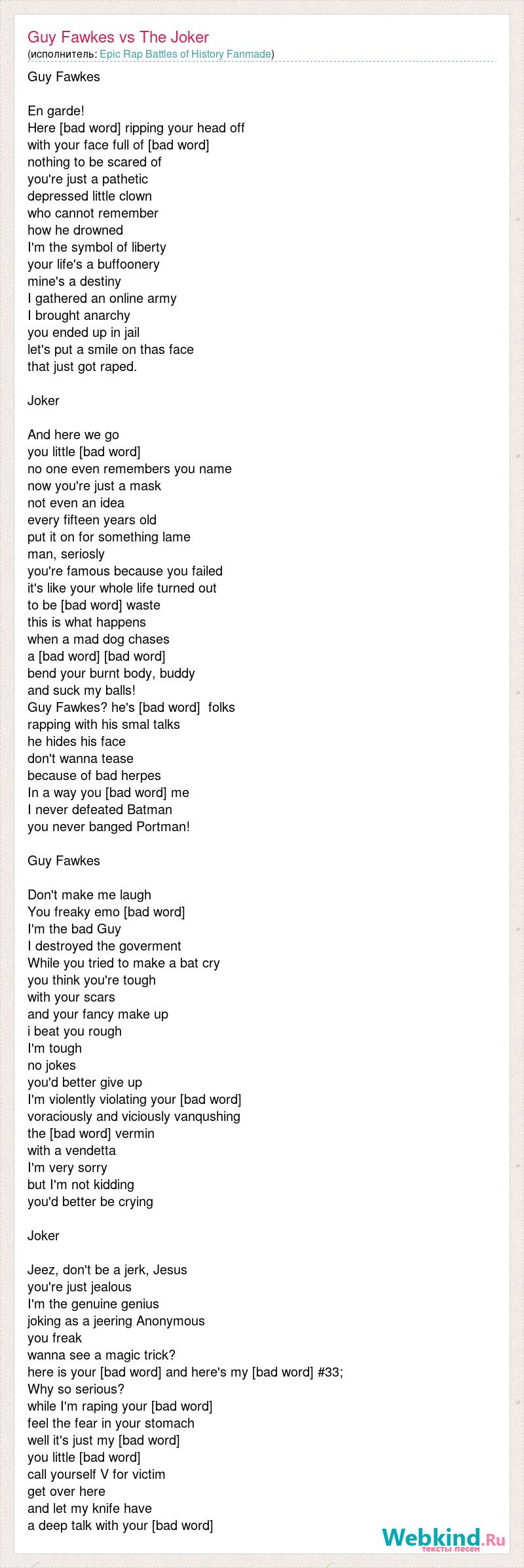 Guy Fawkes En garde! Here [bad word] ripping your head off with your face full of [bad word] nothing to be scared of you're just a pathetic depressed little clown who cannot remember how he drowned I'm the symbol of liberty your life's a buffoonery mine's a destiny I gathered an online army I brought anarchy you ended up in jail let's put a smile on thas face that just got raped. Joker And here we go you little [bad word] no one even remembers you name now you're just a mask not even an idea every fifteen years old put it on for something lame man, seriosly you're famous because you failed it's like your whole life turned out to be [bad word] waste this is what happens when a mad dog chases a [bad word] [bad word] bend your burnt body, buddy and suck my balls! Guy Fawkes? he's [bad word] folks rapping with his smal talks he hides his face don't wanna tease because of bad herpes In a way you [bad word] me I never defeated Batman you never banged Portman! Guy Fawkes Don't make me laugh You freaky emo [bad word] I'm the bad Guy I destroyed the goverment While you tried to make a bat cry you think you're tough with your scars and your fancy make up i beat you rough I'm tough no jokes you'd better give up I'm violently violating your [bad word] voraciously and viciously vanqushing the [bad word] vermin with a vendetta I'm very sorry but I'm not kidding you'd better be crying Joker Jeez, don't be a jerk, Jesus you're just jealous I'm the genuine genius joking as a jeering Anonymous you freak wanna see a magic trick? here is your [bad word] and here's my [bad word] #33; Why so serious? while I'm raping your [bad word] feel the fear in your stomach well it's just my [bad word] you little [bad word] call yourself V for victim get over here and let my knife have a deep talk with your [bad word]