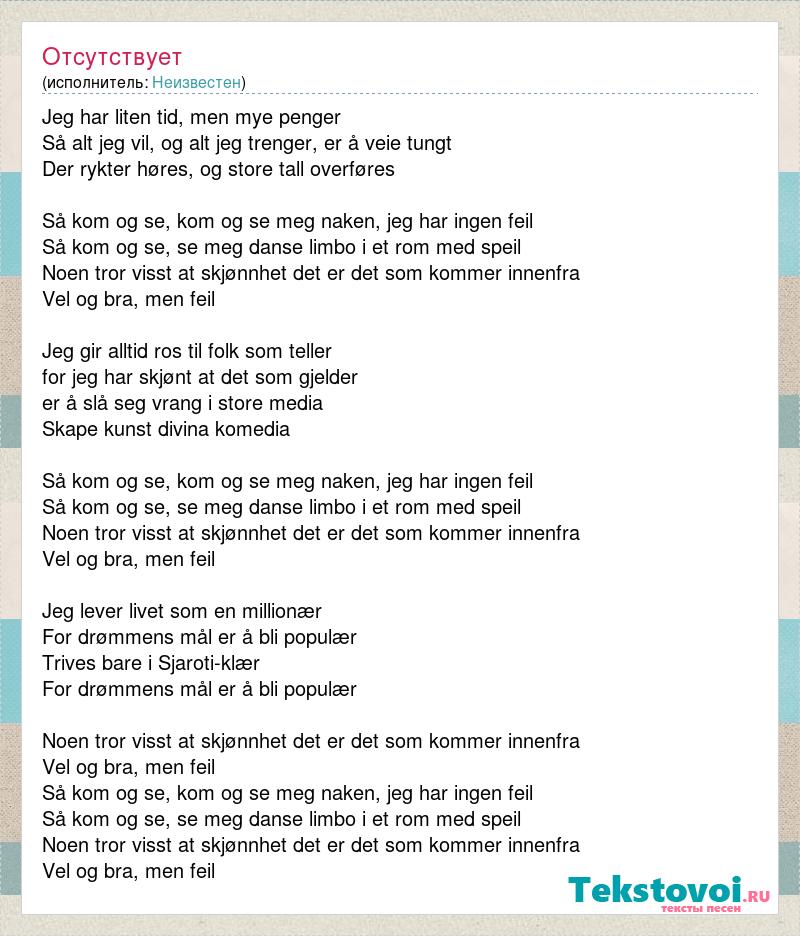 Jeg har liten tid, men mye penger Så alt jeg vil, og alt jeg trenger, er å veie tungt Der rykter høres, og store tall overføres Så kom og se, kom og se meg naken, jeg har ingen feil Så kom og se, se meg danse limbo i et rom med speil Noen tror visst at skjønnhet det er det som kommer innenfra Vel og bra, men feil Jeg gir alltid ros til folk som teller for jeg har skjønt at det som gjelder er å slå seg vrang i store media Skape kunst divina komedia Så kom og se, kom og se meg naken, jeg har ingen feil Så kom og se, se meg danse limbo i et rom med speil Noen tror visst at skjønnhet det er det som kommer innenfra Vel og bra, men feil Jeg lever livet som en millionær For drømmens mål er å bli populær Trives bare i Sjaroti-klær For drømmens mål er å bli populær Noen tror visst at skjønnhet det er det som kommer innenfra Vel og bra, men feil Så kom og se, kom og se meg naken, jeg har ingen feil Så kom og se, se meg danse limbo i et rom med speil Noen tror visst at skjønnhet det er det som kommer innenfra Vel og bra, men feil
