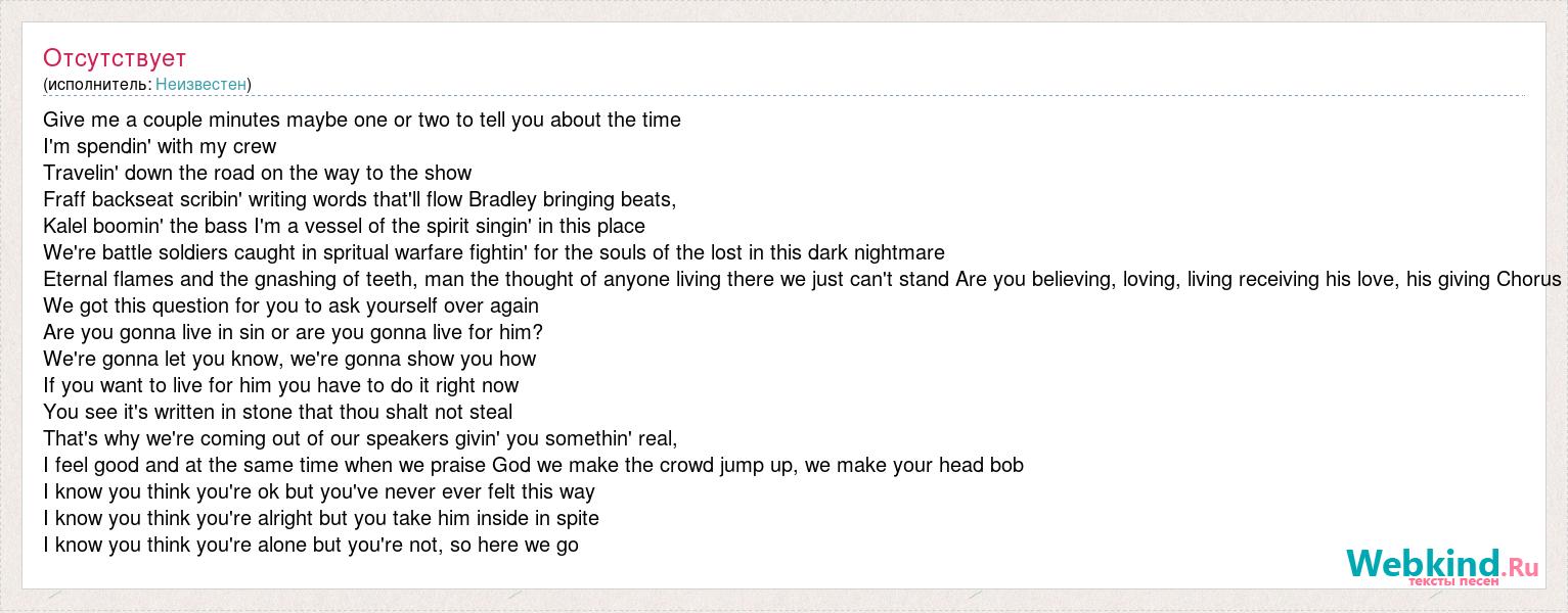 Give me a couple minutes maybe one or two to tell you about the time I'm spendin' with my crew Travelin' down the road on the way to the show Fraff backseat scribin' writing words that'll flow Bradley bringing beats, Kalel boomin' the bass I'm a vessel of the spirit singin' in this place We're battle soldiers caught in spritual warfare fightin' for the souls of the lost in this dark nightmare Eternal flames and the gnashing of teeth, man the thought of anyone living there we just can't stand Are you believing, loving, living receiving his love, his giving Chorus We got this question for you to ask yourself over again Are you gonna live in sin or are you gonna live for him? We're gonna let you know, we're gonna show you how If you want to live for him you have to do it right now You see it's written in stone that thou shalt not steal That's why we're coming out of our speakers givin' you somethin' real, I feel good and at the same time when we praise God we make the crowd jump up, we make your head bob I know you think you're ok but you've never ever felt this way I know you think you're alright but you take him inside in spite I know you think you're alone but you're not, so here we go