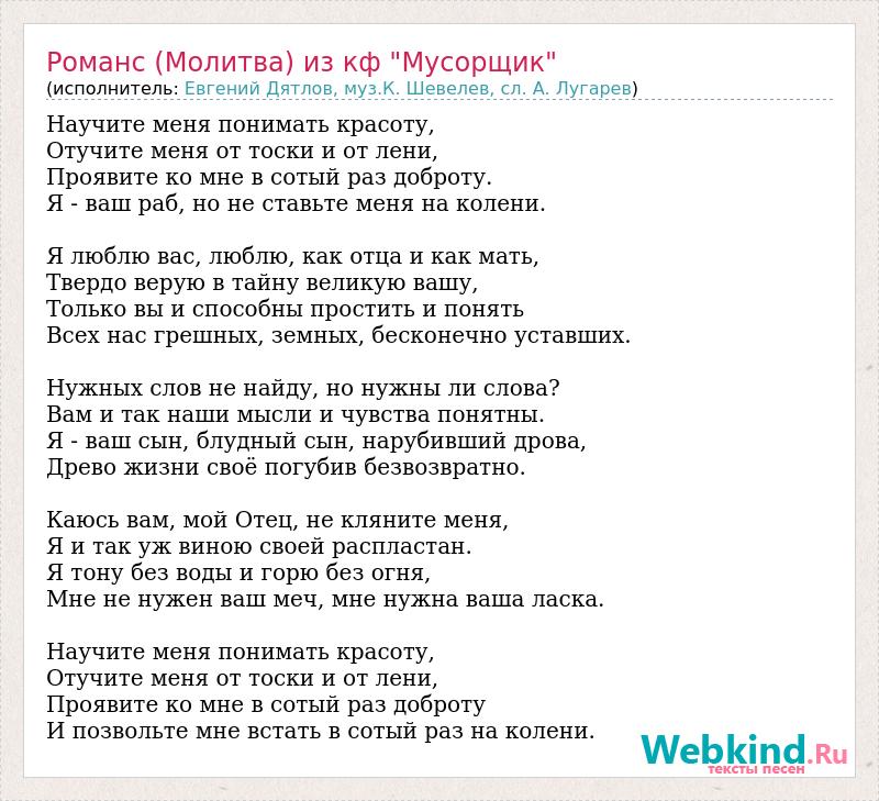 Главная→Исполнители→Евгений Дятлов, муз.К. Шевелев, сл. А. Лугарев→Романс (Молитва) из кф "Мусорщик"