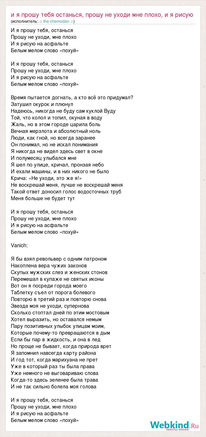 И я прошу тебя, останься Прошу не уходи, мне плохо И я рисую на асфальте Белым мелом слово «похуй» И я прошу тебя, останься Прошу не уходи, мне плохо И я рисую на асфальте Белым мелом слово «похуй» Время пытается догнать, а кто всё это придумал? Затушил окурок и плюнул Надеюсь, никогда не буду сам куклой Вуду Той, что колол и топил, окуная в воду Жаль, но в этом городе царила боль Вечная мерзлота и абсолютный ноль Люди, как гной, но всегда заранее Он понимал, но не искал понимания Я никогда не видел здесь свет в окне И полумесяц улыбался мне Я шел по улице, кричал, пронзая небо И ехали машины, и в них никого не было Крича: «Не уходи, это же я!» Не воскрешай меня, лучше не воскрешай меня Такой ответ доносил голос водосточных труб Меня больше не будет тут И я прошу тебя, останься Прошу не уходи, мне плохо И я рисую на асфальте Белым мелом слово «похуй» Vanich: Я бы взял револьвер с одним патроном Накоплена вера чужих законов Скупых мужских слез и женских стонов Перемешал в купаже не святых иконы Вот он я посреди города моего Таблетку съел от порога болевого Повторю в третий раз и повторю снова Звезда моя не уходи, супернова Сколько стоптал дней по этим мостовым Хотел выразить, но оставался немым Пару позитивных улыбок улицам моим, Которые почему-то превращаются в дым Если бы пар в жидкость, и она в лед Но проще не бывает, когда природа врет Я запомнил навсегда карту района И год тот, когда марихуана не прет Уже в который раз ты была права Уже немного не выговариваю слова Когда-то здесь зеленее была трава И не так сильно болела моя голова И я прошу тебя, останься Прошу не уходи, мне плохо И я рисую на асфальте Белым мелом слово «похуй»