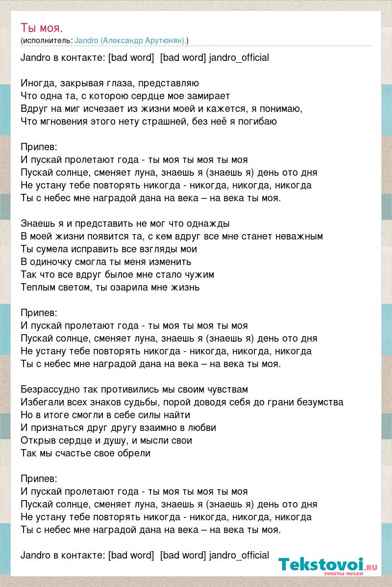 Jandro в контакте: [bad word] [bad word] jandro_official Иногда, закрывая глаза, представляю Что одна та, с которою сердце мое замирает Вдруг на миг исчезает из жизни моей и кажется, я понимаю, Что мгновения этого нету страшней, без неё я погибаю Припев: И пускай пролетают года - ты моя ты моя ты моя Пускай солнце, сменяет луна, знаешь я (знаешь я) день ото дня Не устану тебе повторять никогда - никогда, никогда, никогда Ты с небес мне наградой дана на века – на века ты моя. Знаешь я и представить не мог что однажды В моей жизни появится та, с кем вдруг все мне станет неважным Ты сумела исправить все взгляды мои В одиночку смогла ты меня изменить Так что все вдруг былое мне стало чужим Теплым светом, ты озарила мне жизнь Припев: И пускай пролетают года - ты моя ты моя ты моя Пускай солнце, сменяет луна, знаешь я (знаешь я) день ото дня Не устану тебе повторять никогда - никогда, никогда, никогда Ты с небес мне наградой дана на века – на века ты моя. Безрассудно так противились мы своим чувствам Избегали всех знаков судьбы, порой доводя себя до грани безумства Но в итоге смогли в себе силы найти И признаться друг другу взаимно в любви Открыв сердце и душу, и мысли свои Так мы счастье свое обрели Припев: И пускай пролетают года - ты моя ты моя ты моя Пускай солнце, сменяет луна, знаешь я (знаешь я) день ото дня Не устану тебе повторять никогда - никогда, никогда, никогда Ты с небес мне наградой дана на века – на века ты моя. Jandro в контакте: [bad word] [bad word] jandro_official