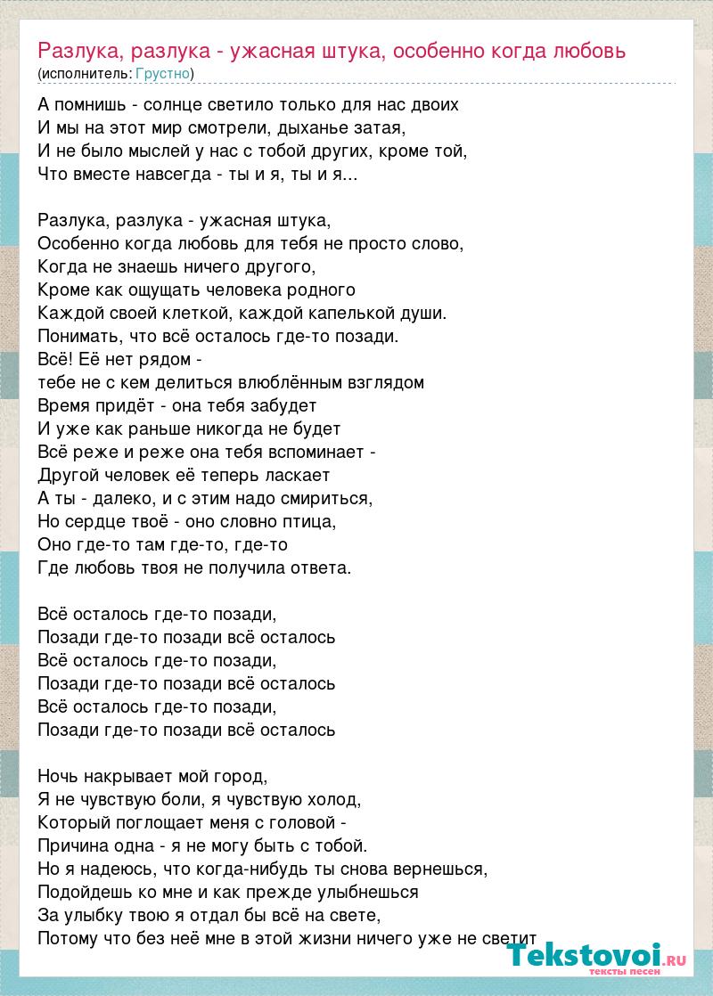 А помнишь - солнце светило только для нас двоих И мы на этот мир смотрели, дыханье затая, И не было мыслей у нас с тобой других, кроме той, Что вместе навсегда - ты и я, ты и я... Разлука, разлука - ужасная штука, Особенно когда любовь для тебя не просто слово, Когда не знаешь ничего другого, Кроме как ощущать человека родного Каждой своей клеткой, каждой капелькой души. Понимать, что всё осталось где-то позади. Всё! Её нет рядом - тебе не с кем делиться влюблённым взглядом Время придёт - она тебя забудет И уже как раньше никогда не будет Всё реже и реже она тебя вспоминает - Другой человек её теперь ласкает А ты - далеко, и с этим надо смириться, Но сердце твоё - оно словно птица, Оно где-то там где-то, где-то Где любовь твоя не получила ответа. Всё осталось где-то позади, Позади где-то позади всё осталось Всё осталось где-то позади, Позади где-то позади всё осталось Всё осталось где-то позади, Позади где-то позади всё осталось Ночь накрывает мой город, Я не чувствую боли, я чувствую холод, Который поглощает меня с головой - Причина одна - я не могу быть с тобой. Но я надеюсь, что когда-нибудь ты снова вернешься, Подойдешь ко мне и как прежде улыбнешься За улыбку твою я отдал бы всё на свете, Потому что без неё мне в этой жизни ничего уже не светит