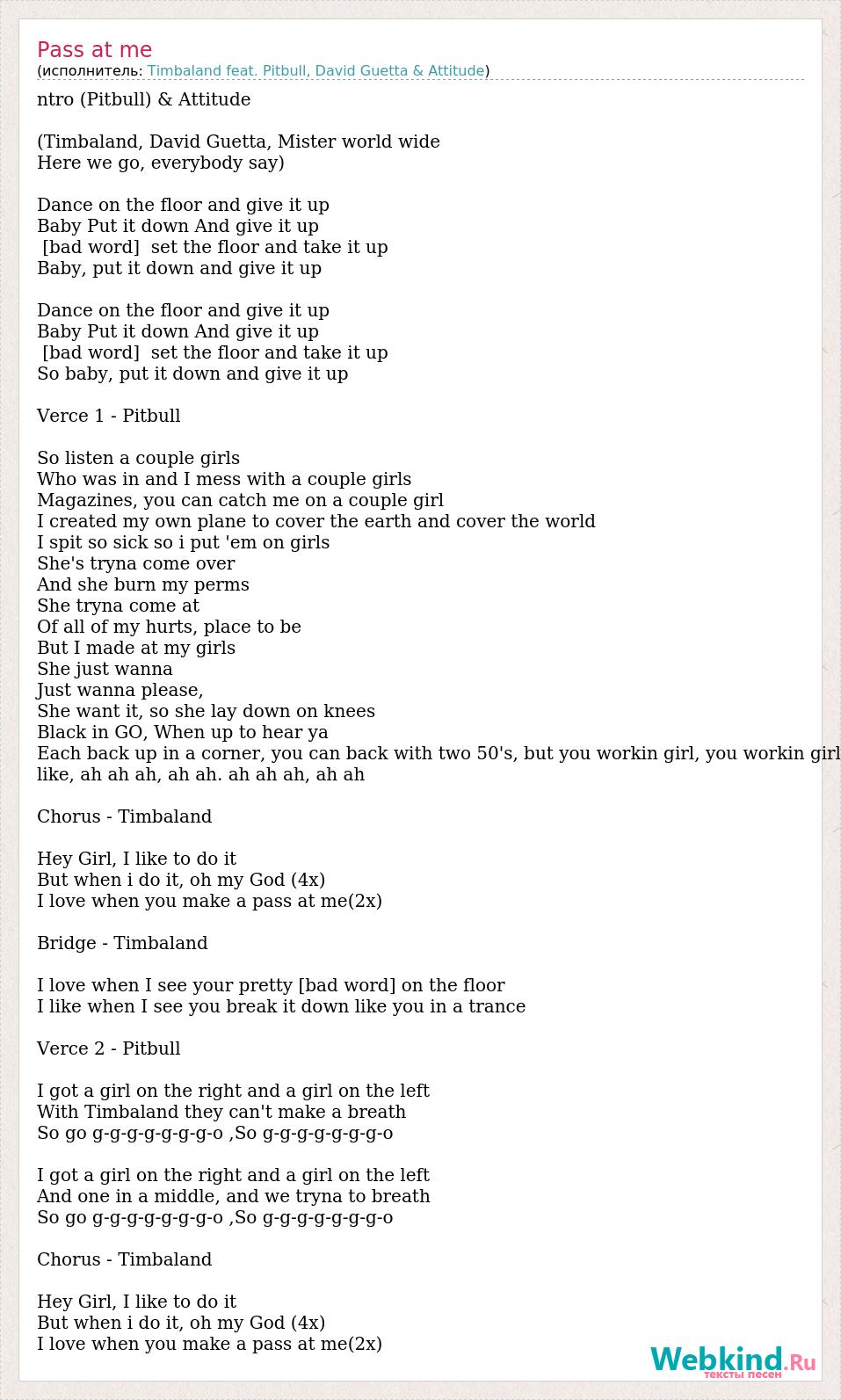 ntro (Pitbull) & Attitude (Timbaland, David Guetta, Mister world wide Here we go, everybody say) Dance on the floor and give it up Baby Put it down And give it up [bad word] set the floor and take it up Baby, put it down and give it up Dance on the floor and give it up Baby Put it down And give it up [bad word] set the floor and take it up So baby, put it down and give it up Verce 1 - Pitbull So listen a couple girls Who was in and I mess with a couple girls Magazines, you can catch me on a couple girl I created my own plane to cover the earth and cover the world I spit so sick so i put 'em on girls She's tryna come over And she burn my perms She tryna come at Of all of my hurts, place to be But I made at my girls She just wanna Just wanna please, She want it, so she lay down on knees Black in GO, When up to hear ya Each back up in a corner, you can back with two 50's, but you workin girl, you workin girl like, ah ah ah, ah ah. ah ah ah, ah ah Chorus - Timbaland Hey Girl, I like to do it But when i do it, oh my God (4x) I love when you make a pass at me(2x) Bridge - Timbaland I love when I see your pretty [bad word] on the floor I like when I see you break it down like you in a trance Verce 2 - Pitbull I got a girl on the right and a girl on the left With Timbaland they can't make a breath So go g-g-g-g-g-g-g-o ,So g-g-g-g-g-g-g-o I got a girl on the right and a girl on the left And one in a middle, and we tryna to breath So go g-g-g-g-g-g-g-o ,So g-g-g-g-g-g-g-o Chorus - Timbaland Hey Girl, I like to do it But when i do it, oh my God (4x) I love when you make a pass at me(2x)