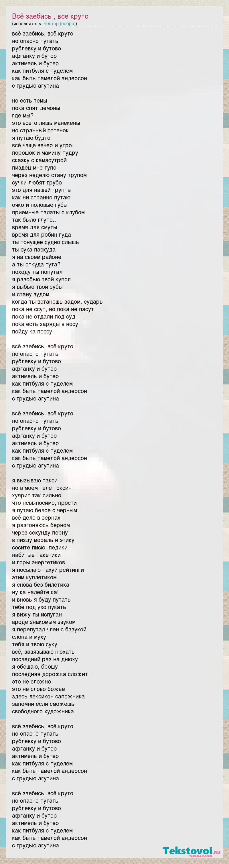 всё заебись, всё круто но опасно путать рублевку и бутово афганку и бутор актимель и бутер как питбуля с пуделем как быть памелой андерсон с грудью агутина но есть темы пока спят демоны где мы? это всего лишь манекены но странный оттенок я путаю будто всё чаще вечер и утро порошок и мамину пудру сказку с камасутрой пиздец мне тупо через неделю стану трупом сучки любят грубо это для нашей группы как ни странно путаю очко и половые губы приемные палаты с клубом так было глупо.. время для смуты время для робин гуда ты тонущее судно слышь ты сука паскуда я на своем районе а ты откуда тута? походу ты попутал я разобью твой купол я выбью твои зубы и стану зудом когда ты встанешь задом, сударь пока не ссут, но пока не пасут пока не отдали под суд пока есть заряды в носу пойду ка поссу всё заебись, всё круто но опасно путать рублевку и бутово афганку и бутор актимель и бутер как питбуля с пуделем как быть памелой андерсон с грудью агутина всё заебись, всё круто но опасно путать рублевку и бутово афганку и бутор актимель и бутер как питбуля с пуделем как быть памелой андерсон с грудью агутина я вызываю такси но в моем теле токсин хуярит так сильно что невыносимо, прости я путаю белое с черным всё дело в зернах я разгоняюсь берном через секунду перну в пизду мораль и этику сосите писю, педики набитые пакетики и горы энергетиков я посылаю нахуй рейтинги этим куплетиком я снова без билетика ну ка налейте ка! и вновь я буду путать тебе под ухо пукать я вижу ты испуган вроде знакомым звуком я перепутал член с базукой слона и муху тебя и твою суку всё, завязываю нюхать последний раз на днюху я обещаю, брошу последняя дорожка сложит это не сложно это не слово божье здесь лексикон сапожника запомни если сможешь свободного художника всё заебись, всё круто но опасно путать рублевку и бутово афганку и бутор актимель и бутер как питбуля с пуделем как быть памелой андерсон с грудью агутина всё заебись, всё круто но опасно путать рублевку и бутово афганку и бутор актимель и бутер как питбуля с пуделем как быть памелой андерсон с грудью агутина