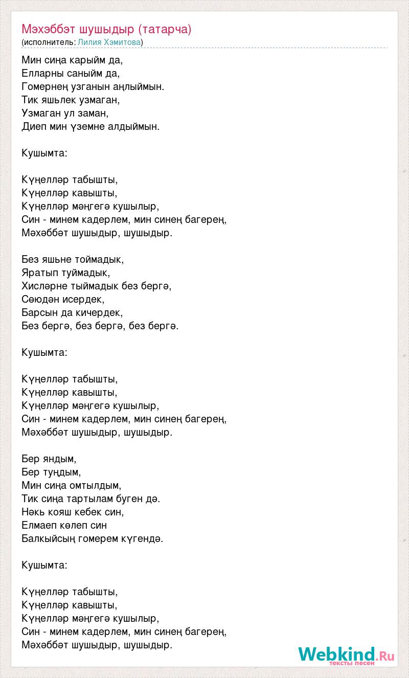Мин сиңа карыйм да, Елларны саныйм да, Гомернең узганын аңлыймын. Тик яшьлек узмаган, Узмаган ул заман, Диеп мин үземне алдыймын. Кушымта: Күңелләр табышты, Күңелләр кавышты, Күңелләр мәңгегә кушылыр, Син - минем кадерлем, мин синең багерең, Мәхәббәт шушыдыр, шушыдыр. Без яшьне тоймадык, Яратып туймадык, Хисләрне тыймадык без бергә, Сөюдән исердек, Барсын да кичердек, Без бергә, без бергә, без бергә. Кушымта: Күңелләр табышты, Күңелләр кавышты, Күңелләр мәңгегә кушылыр, Син - минем кадерлем, мин синең багерең, Мәхәббәт шушыдыр, шушыдыр. Бер яндым, Бер туңдым, Мин сиңа омтылдым, Тик сиңа тартылам буген дә. Нәкь кояш кебек син, Елмаеп көлеп син Балкыйсың гомерем күгендә. Кушымта: Күңелләр табышты, Күңелләр кавышты, Күңелләр мәңгегә кушылыр, Син - минем кадерлем, мин синең багерең, Мәхәббәт шушыдыр, шушыдыр.