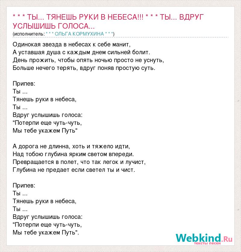 Одинокая звезда в небесах к себе манит, А уставшая душа с каждым днем сильней болит. День прожить, чтобы опять ночью просто не уснуть, Больше нечего терять, вдруг поняв простую суть. Припев: Ты ... Тянешь руки в небеса, Ты ... Вдруг услышишь голоса: "Потерпи еще чуть-чуть, Мы тебе укажем Путь" А дорога не длинна, хоть и тяжело идти, Над тобою глубина ярким светом впереди. Превращается в полет, что так легок и лучист, Глубина не предает если светел ты и чист. Припев: Ты ... Тянешь руки в небеса, Ты ... Вдруг услышишь голоса: "Потерпи еще чуть-чуть, Мы тебе укажем Путь".