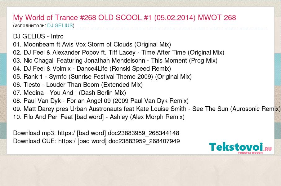 DJ GELIUS - Intro 01. Moonbeam ft Avis Vox Storm of Clouds (Original Mix) 02. DJ Feel & Alexander Popov ft. Tiff Lacey - Time After Time (Original Mix) 03. Nic Chagall Featuring Jonathan Mendelsohn - This Moment (Prog Mix) 04. DJ Feel & Volmix - Dance4Life (Ronski Speed Remix) 05. Rank 1 - Symfo (Sunrise Festival Theme 2009) (Original Mix) 06. Tiesto - Louder Than Boom (Extended Mix) 07. Medina - You And I (Dash Berlin Mix) 08. Paul Van Dyk - For an Angel 09 (2009 Paul Van Dyk Remix) 09. Matt Darey pres Urban Austronauts feat Kate Louise Smith - See The Sun (Aurosonic Remix) 10. Filo And Peri Feat Aruna - Ashley (Alex Morph Remix) Download mp3: https:/ [bad word] doc23883959_268344148 Download CUE: https:/ [bad word] doc23883959_268407949