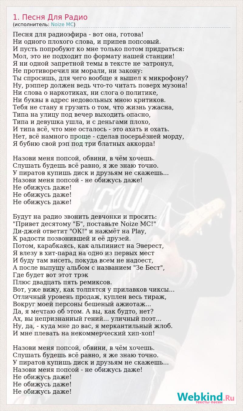 Песня для радиоэфира - вот она, готова! Ни одного плохого слова, и припев попсовый. И пусть попробуют ко мне только потом придраться: Мол, это не подходит по формату нашей станции! Я ни одной запретной темы в тексте не затронул, Не противоречил ни морали, ни закону: Ты спросишь, для чего вообще я вышел к микрофону? Ну, рэппер должен ведь что-то читать поверх музона! Ни слова о наркотиках, ни слога о политике, Ни буквы в адрес недовольных мною критиков. Тебя не стану я грузить о том, что жизнь ужасна, Типа на улицу под вечер выходить опасно, Типа и девушка ушла, и с деньгами плохо, И типа всё, что мне осталось - это ахать и охать. Нет, всё намного проще - сделав посерьёзней морду, Я бубню свой рэп под три блатных аккорда! Назови меня попсой, обвини, в чём хочешь. Слушать будешь всё равно, я же знаю точно. У пиратов купишь диск и друзьям не скажешь... Назови меня попсой - не обижусь даже! Не обижусь даже! Не обижусь даже! Не обижусь даже! Будут на радио звонить девчонки и просить: "Привет десятому "Б", поставьте Noize MC!" Ди-джей ответит "ОК!" и нажмёт на Play, К радости позвонившей и её друзей. Потом, карабкаясь, как альпинист на Эверест, Я влезу в хит-парад на одно из первых мест И буду там висеть, покуда всем не надоест, А после выпущу альбом с названием "Зе Бест", Где будет вот этот трэк Плюс двадцать пять ремиксов. Вот, уже вижу, как толпятся у прилавков чиксы... Отличный уровень продаж, куплен весь тираж, Вокруг моей персоны бешеный ажиотаж... Да, я мечтаю об этом. А вы, как будто, нет? Ах, вы непризнанный гений... уличный поэт... Ну, да, - куда мне до вас, я меркантильный жлоб. И мне плевать на некоммерческий хип-хоп! Назови меня попсой, обвини, в чём хочешь. Слушать будешь всё равно, я же знаю точно. У пиратов купишь диск и друзьям не скажешь... Назови меня попсой - не обижусь даже! Не обижусь даже! Не обижусь даже! Не обижусь даже!