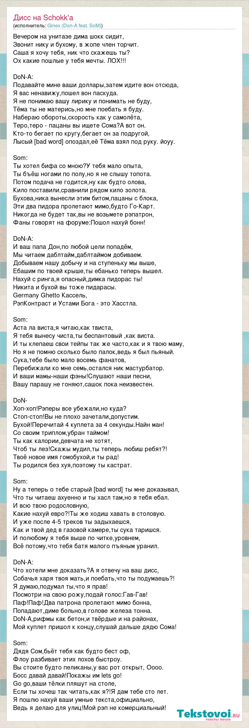 Вечером на унитазе дима шокк сидит, Звонит нику и бухому, в жопе член торчит. Саша я хочу тебя, ник что скажешь ты? Ох какие пошлые у тебя мечты. ЛОХ!!! DoN-A: Подавайте мине ваши доллары,затем идите вон отсюда, Я вас ненавижу,пошел вон паскуда. Я не понимаю вашу лирику и понимать не буду, Тёма ты не матерись,но мне поебать я буду. Набераю обороты,скорость как у самолёта, Теро,теро - пацаны вы ищете Сома?А вот он. Кто-то бегает по кругу,бегает он за подругой, Лысый [bad word] опоздал,её Тёма взял под руку. йоуу. Som: Ты хотел бифа со мною?У тебя мало опыта, Ты бъёш ногами по полу,но я не слышу топота. Потом подача не годится,ну как будто олова, Кило поставили,сравнили рядом кило золота. Бухова,ника вынесли этим битом,пацаны с блока, Эти два пидора пролетают мимо,будто Го-Карт. Никогда не будет так,вы не возьмете рэпатрон, Фаны говорят на форуме:Пошол нахуй бонн! DoN-A: И ваш папа Дон,по любой цели попадём, Мы читаем даблтайм,даблтаймом добиваем. Добываем нашу добычу и на ступеньку мы выше, Ебашим по твоей крыше,ты ебанько теперь вышел. Нахуй с ринга,я опасный,димка пидорас ты! Никита и бухой вы тоже пидарасы. Germany Ghetto Кассель, РэпКонтраст и Устами Бога - это Хасстла. Som: Аста ла виста,я читаю,как твиста, Я тебя вынесу чиста,ты беспантовый ,как виста. И ты клепаеш свои тейпы так же часто,как и я твою маму, Но я не помню сколько было палок,ведь я был пьяный. Сука,тебе было мало восемь фанатов, Перебижали ко мне семь,остался ник мастурбатор. И ваши мамы-наши фэны!Слушают наши песни, Вашу парашу не гоняют,сашок пока неизвестен. DoN- Хоп-хоп!Рэперы все убежали,но куда? Стоп-стоп!Вы не плохо зачетали,допустим. Бухой!Перечитай 4 куплета за 4 секунды.Найн ман! Со своим триплом,убран таймом! Ты как калории,девчата не хотят, Чтоб ты лез!Скажы мудил,ты теперь любиш ребят?! Твоё новое имя гомобухой,и ты рад! Ты родился без хуя,поэтому ты кастрат. Som: Ну а теперь о тебе старый [bad word] ты мне доказывал, Что ты читаеш ахуенно и ты хасл там,но я тебя ебал. И всю твою родословную, Какие нахуй евро?!Ты же ходиш хавать в столовую. И уже после 4-5 треков ты задыхаешся, Как и твой дед в газовой камере,ты сука таришся. И полюбому я тебя выше по читке,уровнем, Всё потому,что тебя батя малого пъяным уранил. DoN-A: Что хотели мне доказать?А я отвечу на ваш дисс, Собачья харя твоя мать,и поебать,что ты подумаешь?! Я думаю,подумал ты,что я прав! Посмотри на свою рожу,подай голос:Гав-Гав! Паф!Паф!Два патрона пролетают мимо бонна, Попадают,диме больно,в голове железа тонна. DoN-A,рифмы как бетон,и твёрдые и на районах, Мой куплет пришол к концу,слушай дальше дядю Сома! Som: Дядя Сом,бьёт тебя как будто бест оф, Флоу разбивает этих лохов быстроу. Вы стоите будто пеликаны,у вас рот открыт, Оооо. Босс давай давай!Покажы им lets go! Go go,ваши тёлки пляшут на столе, Если ты хочеш так читать,как я?!Я дам тебе сто лет. Я пошлю нахуй ваши умные текста,официально, Ведь я делаю для улиц!Мой рэп не комерциальный!