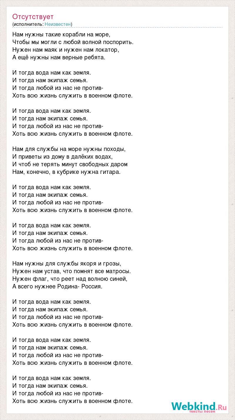 Нам нужны такие корабли на море, Чтобы мы могли с любой волной поспорить. Нужен нам маяк и нужен нам локатор, А ещё нужны нам верные ребята. И тогда вода нам как земля. И тогда нам экипаж семья. И тогда любой из нас не против- Хоть всю жизнь служить в военном флоте. И тогда вода нам как земля. И тогда нам экипаж семья. И тогда любой из нас не против- Хоть всю жизнь служить в военном флоте. Нам для службы на море нужны походы, И приветы из дому в далёких водах, И чтоб не терять минут свободных даром Нам, конечно, в кубрике нужна гитара. И тогда вода нам как земля. И тогда нам экипаж семья. И тогда любой из нас не против- Хоть всю жизнь служить в военном флоте. И тогда вода нам как земля. И тогда нам экипаж семья. И тогда любой из нас не против- Хоть всю жизнь служить в военном флоте. Нам нужны для службы якоря и грозы, Нужен нам устав, что помнят все матросы. Нужен флаг, что реет над волною синей, А всего нужнее Родина- Россия. И тогда вода нам как земля. И тогда нам экипаж семья. И тогда любой из нас не против- Хоть всю жизнь служить в военном флоте. И тогда вода нам как земля. И тогда нам экипаж семья. И тогда любой из нас не против- Хоть всю жизнь служить в военном флоте. И тогда вода нам как земля. И тогда нам экипаж семья. И тогда любой из нас не против- Хоть всю жизнь служить в военном флоте.
