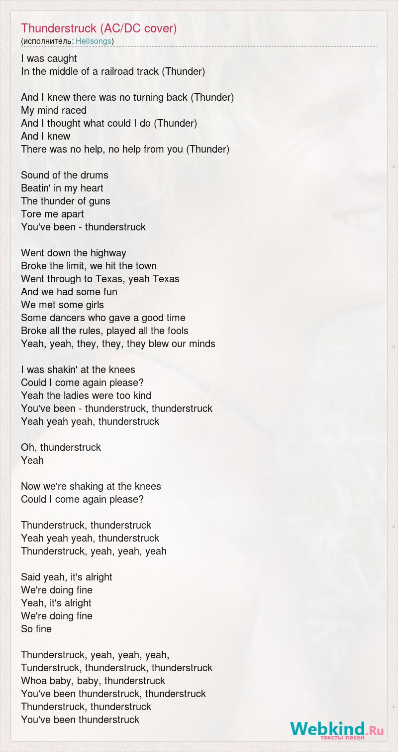 I was caught In the middle of a railroad track (Thunder) And I knew there was no turning back (Thunder) My mind raced And I thought what could I do (Thunder) And I knew There was no help, no help from you (Thunder) Sound of the drums Beatin' in my heart The thunder of guns Tore me apart You've been - thunderstruck Went down the highway Broke the limit, we hit the town Went through to Texas, yeah Texas And we had some fun We met some girls Some dancers who gave a good time Broke all the rules, played all the fools Yeah, yeah, they, they, they blew our minds I was shakin' at the knees Could I come again please? Yeah the ladies were too kind You've been - thunderstruck, thunderstruck Yeah yeah yeah, thunderstruck Oh, thunderstruck Yeah Now we're shaking at the knees Could I come again please? Thunderstruck, thunderstruck Yeah yeah yeah, thunderstruck Thunderstruck, yeah, yeah, yeah Said yeah, it's alright We're doing fine Yeah, it's alright We're doing fine So fine Thunderstruck, yeah, yeah, yeah, Tunderstruck, thunderstruck, thunderstruck Whoa baby, baby, thunderstruck You've been thunderstruck, thunderstruck Thunderstruck, thunderstruck You've been thunderstruck