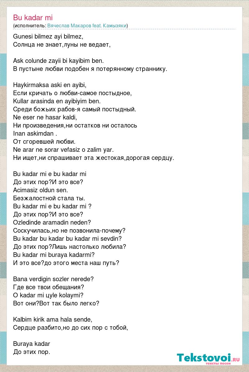 Gunesi bilmez ayi bilmez, Солнца не знает,луны не ведает, Ask colunde zayii bi kayibim ben. В пустыне любви подобен я потерянному страннику. Haykirmaksa aski en ayibi, Если кричать о любви-самое постыдное, Kullar arasinda en ayibiyim ben. Среди божьих рабов-я самый постыдный. Ne eser ne hasar kaldi, Ни произведения,ни остатков ни осталось Inan askimdan . От сгоревшей любви. Ne arar ne sorar vefasiz o zalim yar. Ни ищет,ни спрашивает эта жестокая,дорогая сердцу. Bu kadar mi e bu kadar mi До этих пор?И это все? Acimasiz oldun sen. Безжалостной стала ты. Bu kadar mi e bu kadar mi ? До этих пор?И это все? Ozledinde aramadin neden? Соскучилась,но не позвонила-почему? Bu kadar bu kadar bu kadar mi sevdin? До этих пор?Лишь настолько любила? Bu kadar mi buraya kadarmi? И это все?до этого места наш путь? Bana verdigin sozler nerede? Где все твои обещания? O kadar mi цyle kolaymi? Вот они?Вот так было легко? Kalbim kirik ama hala sende, Сердце разбито,но до сих пор с тобой, Buraya kadar До этих пор.