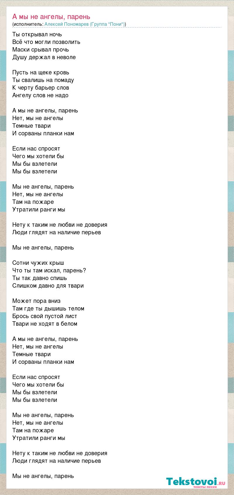 Ты открывал ночь Всё что могли позволить Маски срывал прочь Душу держал в неволе Пусть на щеке кровь Ты свалишь на помаду К черту барьер слов Ангелу слов не надо А мы не ангелы, парень Нет, мы не ангелы Темные твари И сорваны планки нам Если нас спросят Чего мы хотели бы Мы бы взлетели Мы бы взлетели Мы не ангелы, парень Нет, мы не ангелы Там на пожаре Утратили ранги мы Нету к таким не любви не доверия Люди глядят на наличие перьев Мы не ангелы, парень Сотни чужих крыш Что ты там искал, парень? Ты так давно спишь Слишком давно для твари Может пора вниз Там где ты дышишь телом Брось свой пустой лист Твари не ходят в белом А мы не ангелы, парень Нет, мы не ангелы Темные твари И сорваны планки нам Если нас спросят Чего мы хотели бы Мы бы взлетели Мы бы взлетели Мы не ангелы, парень Нет, мы не ангелы Там на пожаре Утратили ранги мы Нету к таким не любви не доверия Люди глядят на наличие перьев Мы не ангелы, парень