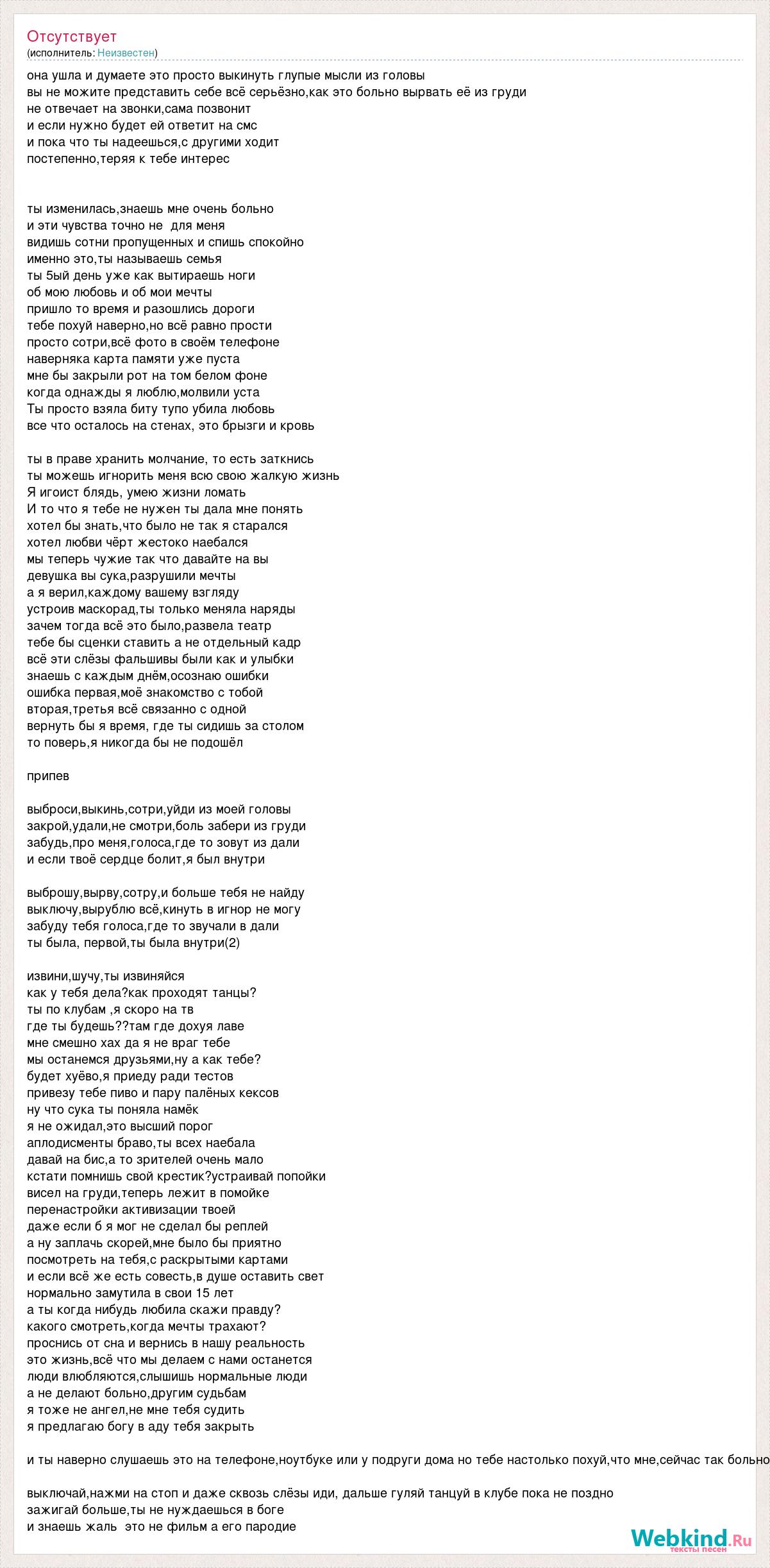 она ушла и думаете это просто выкинуть глупые мысли из головы вы не можите представить себе всё серьёзно,как это больно вырвать её из груди не отвечает на звонки,сама позвонит и если нужно будет ей ответит на смс и пока что ты надеешься,с другими ходит постепенно,теряя к тебе интерес ты изменилась,знаешь мне очень больно и эти чувства точно не для меня видишь сотни пропущенных и спишь спокойно именно это,ты называешь семья ты 5ый день уже как вытираешь ноги об мою любовь и об мои мечты пришло то время и разошлись дороги тебе похуй наверно,но всё равно прости просто сотри,всё фото в своём телефоне наверняка карта памяти уже пуста мне бы закрыли рот на том белом фоне когда однажды я люблю,молвили уста Ты просто взяла биту тупо убила любовь все что осталось на стенах, это брызги и кровь ты в праве хранить молчание, то есть заткнись ты можешь игнорить меня всю свою жалкую жизнь Я игоист блядь, умею жизни ломать И то что я тебе не нужен ты дала мне понять хотел бы знать,что было не так я старался хотел любви чёрт жестоко наебался мы теперь чужие так что давайте на вы девушка вы сука,разрушили мечты а я верил,каждому вашему взгляду устроив маскорад,ты только меняла наряды зачем тогда всё это было,развела театр тебе бы сценки ставить а не отдельный кадр всё эти слёзы фальшивы были как и улыбки знаешь с каждым днём,осознаю ошибки ошибка первая,моё знакомство с тобой вторая,третья всё связанно с одной вернуть бы я время, где ты сидишь за столом то поверь,я никогда бы не подошёл припев выброси,выкинь,сотри,уйди из моей головы закрой,удали,не смотри,боль забери из груди забудь,про меня,голоса,где то зовут из дали и если твоё сердце болит,я был внутри выброшу,вырву,сотру,и больше тебя не найду выключу,вырублю всё,кинуть в игнор не могу забуду тебя голоса,где то звучали в дали ты была, первой,ты была внутри(2) извини,шучу,ты извиняйся как у тебя дела?как проходят танцы? ты по клубам ,я скоро на тв где ты будешь??там где дохуя лаве мне смешно хах да я не враг тебе мы останемся друзьями,ну а как тебе? будет хуёво,я приеду ради тестов привезу тебе пиво и пару палёных кексов ну что сука ты поняла намёк я не ожидал,это высший порог аплодисменты браво,ты всех наебала давай на бис,а то зрителей очень мало кстати помнишь свой крестик?устраивай попойки висел на груди,теперь лежит в помойке перенастройки активизации твоей даже если б я мог не сделал бы реплей а ну заплачь скорей,мне было бы приятно посмотреть на тебя,с раскрытыми картами и если всё же есть совесть,в душе оставить свет нормально замутила в свои 15 лет а ты когда нибудь любила скажи правду? какого смотреть,когда мечты трахают? проснись от сна и вернись в нашу реальность это жизнь,всё что мы делаем с нами останется люди влюбляются,слышишь нормальные люди а не делают больно,другим судьбам я тоже не ангел,не мне тебя судить я предлагаю богу в аду тебя закрыть и ты наверно слушаешь это на телефоне,ноутбуке или у подруги дома но тебе настолько похуй,что мне,сейчас так больно выключай,нажми на стоп и даже сквозь слёзы иди, дальше гуляй танцуй в клубе пока не поздно зажигай больше,ты не нуждаешься в боге и знаешь жаль это не фильм а его пародие