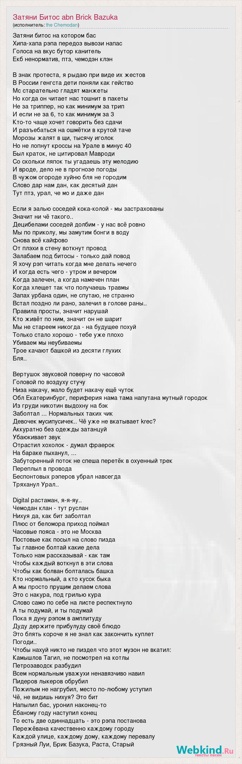 Затяни битос на котором бас Хипа-хапа рэпа передоз вывози напас Голоса на вкус бутор канитель Екб ненорматив, птз, чемодэн клэн В знак протеста, я рыдаю при виде их жестов В России генгста дети поняли как гейство Мс старательно гладят манжеты Но когда он читает нас тошнит в пакеты Не за триппер, но как минимум за трип И если не за 6, то как минимум за 3 Кто-то чаще хочет говорить без сдачи И разъебаться на ошмётки в крутой таче Морозы жалят в щи, тысячу иголок Но не лопнут кроссы на Урале в минус 40 Был краток, не цитировал Мавроди Со скольки ляпок ты угадаешь эту мелодию И вроде, дело не в прогнозе погоды В чужом огороде хуйню бля не городим Слово дар нам дан, как десятый дан Тут птз, урал, че мо и даже дан Если я залью соседей кока-колой - мы застрахованы Значит ни чё такого.. Децибелами соседей долбим - у нас всё ровно Мы по приколу, мы замутим бонги в воду Снова всё кайфово От плэхи в стену воткнут провод Залабаем под битосы - только дай повод Я хочу рэп читать когда мне делать нечего И когда есть чего - утром и вечером Когда залечен, а когда намечен план Когда хлещет так что получаешь травмы Запах урбана один, не спутаю, не странно Встал поздно ли рано, залечил в голове раны.. Правила просты, значит нарушай Кто живёт по ним, значит он не шарит Мы не стареем никогда - на будущее похуй Только стало хорошо - тебе уже плохо Убиваем мы неубиваемы Трое качают башкой из десяти глухих Бля.. Вертушок звуковой поверну по часовой Головой по воздуху стучу Низа накачу, мало будет накачу ещё чуток Обл Екатеринбург, периферия нама тама напутана мутный городок Из груди никотин выдохну на бэк Заболтал ... Нормальных таких чик Девочек мусипусичек.. Чё уже не вкатывает krec? Аккуратно без одежды затанцуй Убаюкивает звук Отрастил хохолок - думал фраерок На бараке пыханул, ... Забуторенный поток не спеша перетёк в охуенный трек Переплыл в провода Беспонтовых рэперов убрал навсегда Тряханул Урал.. Digital растаман, я-я-яу.. Чемодан клан - тут руслан Нихуя да, как бит заболтал Плюс от беломора приход поймал Часовые пояса - это не Москва Постовые как посыл на слово пизда Ты главное болтай какие дела Только нам рассказывай - как там Чтобы каждый воткнул в эти слова Чтобы как болван болталась башка Кто нормальный, а кто кусок быка А мы просто прущим делаем слова Это с накура, под грилью кура Слово само по себе на листе респектнуло А ты подумай, и ты подумай Пока я дуну рэпом в амплитуду Дуду держите прибулуду своё блюдо Это блять короче я не знал как закончить куплет Погоди.. Чтобы нахуй никто не пиздел что этот музон не вкатил: Камышлов Тагил, не посмотрел на котлы Петрозаводск разбудил Всем нормальным уважухи ненавязчиво навил Пидеров лыкеров обрубил Пожилым не нагрубил, место по-любому уступил Чё, не видишь нихуя? Это бит Напылил бас, уронил наконец-то Ёбаному году наступил конец То есть две одиннадцать - это рэпа постанова Пережёвана качественно каждому городу Каждой улице, каждому дому, каждому перевалу Грязный Луи, Брик Базука, Раста, Старый