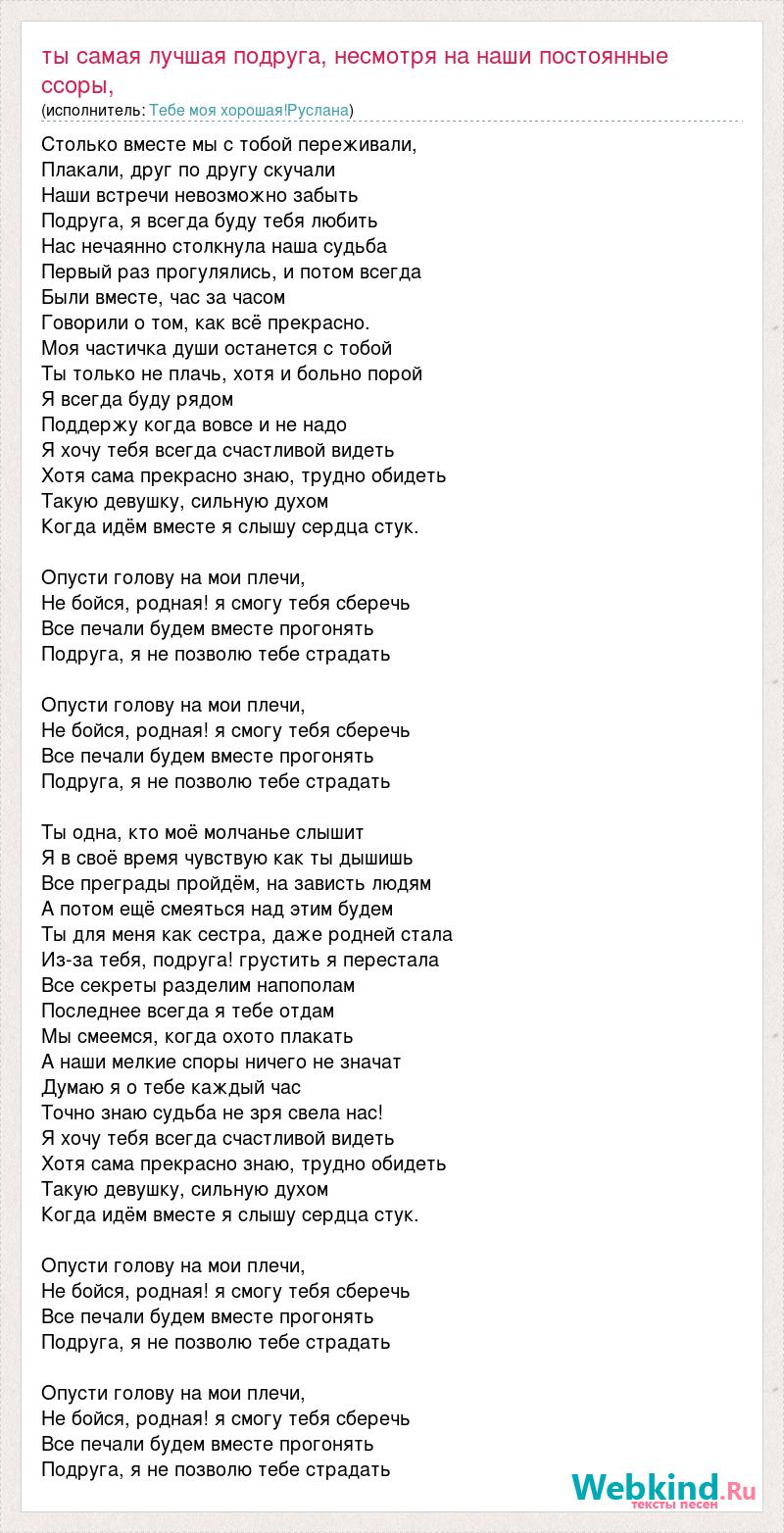 Столько вместе мы с тобой переживали, Плакали, друг по другу скучали Наши встречи невозможно забыть Подруга, я всегда буду тебя любить Нас нечаянно столкнула наша судьба Первый раз прогулялись, и потом всегда Были вместе, час за часом Говорили о том, как всё прекрасно. Моя частичка души останется с тобой Ты только не плачь, хотя и больно порой Я всегда буду рядом Поддержу когда вовсе и не надо Я хочу тебя всегда счастливой видеть Хотя сама прекрасно знаю, трудно обидеть Такую девушку, сильную духом Когда идём вместе я слышу сердца стук. Опусти голову на мои плечи, Не бойся, родная! я смогу тебя сберечь Все печали будем вместе прогонять Подруга, я не позволю тебе страдать Опусти голову на мои плечи, Не бойся, родная! я смогу тебя сберечь Все печали будем вместе прогонять Подруга, я не позволю тебе страдать Ты одна, кто моё молчанье слышит Я в своё время чувствую как ты дышишь Все преграды пройдём, на зависть людям А потом ещё смеяться над этим будем Ты для меня как сестра, даже родней стала Из-за тебя, подруга! грустить я перестала Все секреты разделим напополам Последнее всегда я тебе отдам Мы смеемся, когда охото плакать А наши мелкие споры ничего не значат Думаю я о тебе каждый час Точно знаю судьба не зря свела нас! Я хочу тебя всегда счастливой видеть Хотя сама прекрасно знаю, трудно обидеть Такую девушку, сильную духом Когда идём вместе я слышу сердца стук. Опусти голову на мои плечи, Не бойся, родная! я смогу тебя сберечь Все печали будем вместе прогонять Подруга, я не позволю тебе страдать Опусти голову на мои плечи, Не бойся, родная! я смогу тебя сберечь Все печали будем вместе прогонять Подруга, я не позволю тебе страдать