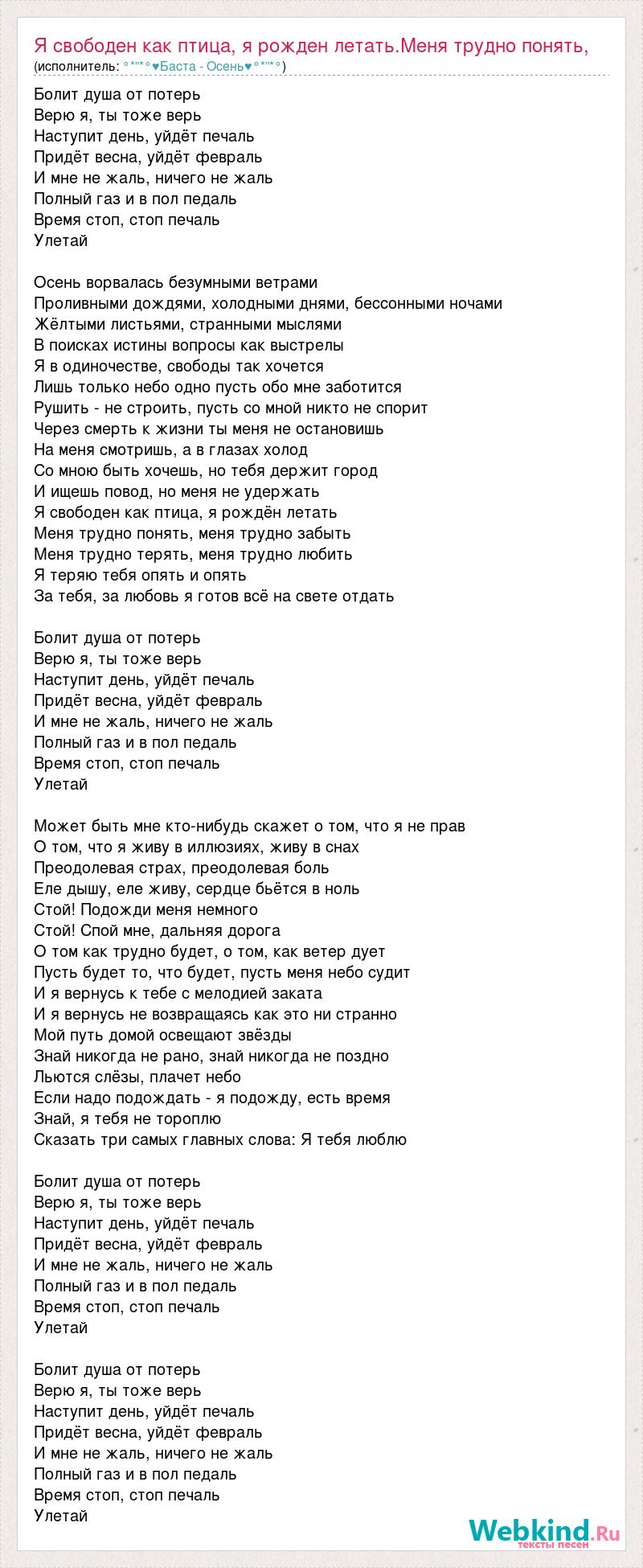 Главная→Исполнители→°*”*°♥Баста - Осень♥°*”*°→Я свободен как птица, я рожден летать.Меня трудно понять, меня трудно забыть