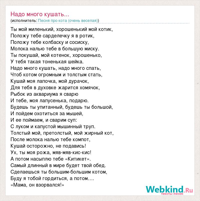 Ты мой миленький, хорошенький мой котик, Положу тебе сарделечку я в ротик, Положу тебе колбаску и сосиску, Молока налью тебе в большую миску. Ты покушай, мой котенок, хорошенько, У тебя такая тоненькая шейка. Надо много кушать, надо много спать, Чтоб котом огромным и толстым стать, Кушай моя лапочка, мой дурачок, Для тебя в духовке жарится хомячок, Рыбок из аквариума я сварю И тебе, моя лапусенька, подарю. Будешь ты упитанный, будешь ты большой, И пойдем охотиться за мышей, И ее поймаем, и сварим суп: С луком и капустой мышинный труп. Толстый мой, претолстый, мой жирный кот, После молока налью тебе компот, Кушай осторожно, не подавись! Ух, ты моя рожа, мяв-мяв-кис-кис! А потом насыплю тебе «Китикет». Самый длинный в мире будет твой обед. Сделаешься ты большим-большим котом, Буду я тобой гордиться, а потом…. «Мама, он взорвался!»