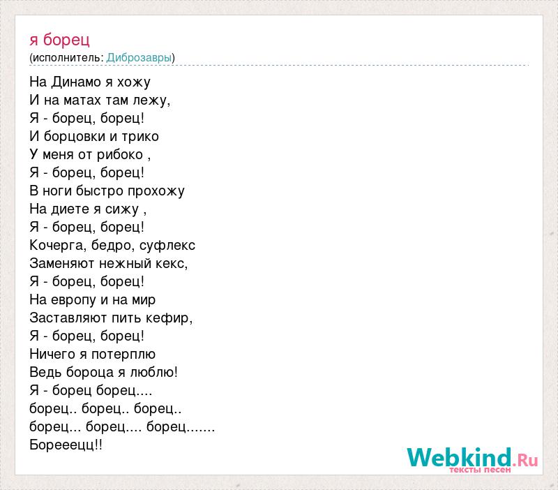 На Динамо я хожу И на матах там лежу, Я - борец, борец! И борцовки и трико У меня от рибоко , Я - борец, борец! В ноги быстро прохожу На диете я сижу , Я - борец, борец! Кочерга, бедро, суфлекс Заменяют нежный кекс, Я - борец, борец! На европу и на мир Заставляют пить кефир, Я - борец, борец! Ничего я потерплю Ведь бороца я люблю! Я - борец борец.... борец.. борец.. борец.. борец... борец.... борец....... Борееецц!!