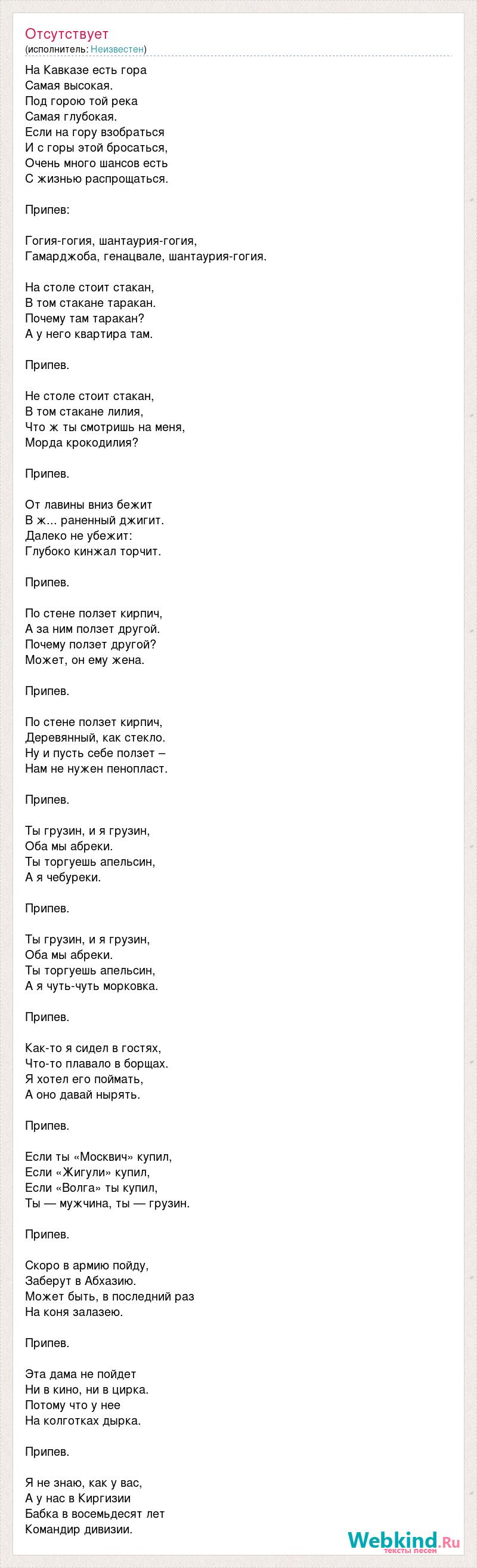 На Кавказе есть гора Самая высокая. Под горою той река Самая глубокая. Если на гору взобраться И с горы этой бросаться, Очень много шансов есть С жизнью распрощаться. Припев: Гогия-гогия, шантаурия-гогия, Гамарджоба, генацвале, шантаурия-гогия. На столе стоит стакан, В том стакане таракан. Почему там таракан? А у него квартира там. Припев. Не столе стоит стакан, В том стакане лилия, Что ж ты смотришь на меня, Морда крокодилия? Припев. От лавины вниз бежит В ж... раненный джигит. Далеко не убежит: Глубоко кинжал торчит. Припев. По стене ползет кирпич, А за ним ползет другой. Почему ползет другой? Может, он ему жена. Припев. По стене ползет кирпич, Деревянный, как стекло. Ну и пусть себе ползет – Нам не нужен пенопласт. Припев. Ты грузин, и я грузин, Оба мы абреки. Ты торгуешь апельсин, А я чебуреки. Припев. Ты грузин, и я грузин, Оба мы абреки. Ты торгуешь апельсин, А я чуть-чуть морковка. Припев. Как-то я сидел в гостях, Что-то плавало в борщах. Я хотел его поймать, А оно давай нырять. Припев. Если ты «Москвич» купил, Если «Жигули» купил, Если «Волга» ты купил, Ты — мужчина, ты — грузин. Припев. Скоро в армию пойду, Заберут в Абхазию. Может быть, в последний раз На коня залазею. Припев. Эта дама не пойдет Ни в кино, ни в цирка. Потому что у нее На колготках дырка. Припев. Я не знаю, как у вас, А у нас в Киргизии Бабка в восемьдесят лет Командир дивизии.