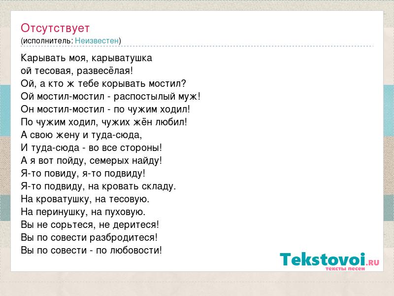 Карывать моя, карыватушка ой тесовая, развесёлая! Ой, а кто ж тебе корывать мостил? Ой мостил-мостил - распостылый муж! Он мостил-мостил - по чужим ходил! По чужим ходил, чужих жён любил! А свою жену и туда-сюда, И туда-сюда - во все стороны! А я вот пойду, семерых найду! Я-то повиду, я-то подвиду! Я-то подвиду, на кровать складу. На кроватушку, на тесовую. На перинушку, на пуховую. Вы не сорьтеся, не деритеся! Вы по совести разбродитеся! Вы по совести - по любовости!