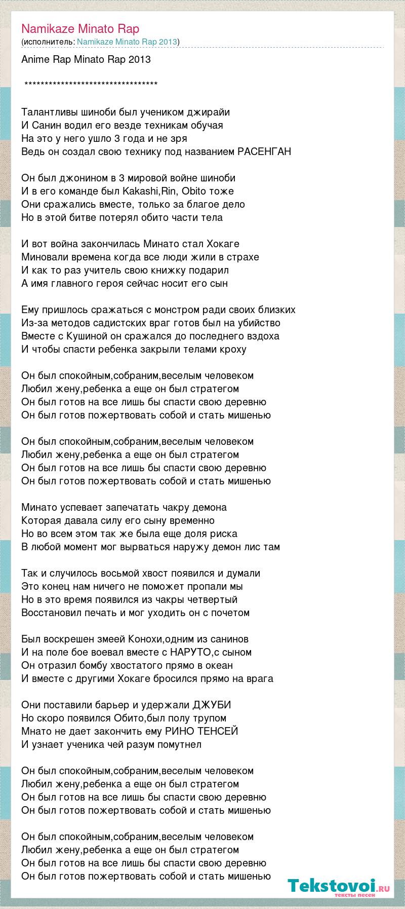 Anime Rap Minato Rap 2013 ********************************* Талантливы шиноби был учеником джирайи И Санин водил его везде техникам обучая На это у него ушло 3 года и не зря Ведь он создал свою технику под названием РАСЕНГАН Он был джонином в 3 мировой войне шиноби И в его команде был Kakashi,Rin, Obito тоже Они сражались вместе, только за благое дело Но в этой битве потерял обито части тела И вот война закончилась Минато стал Хокаге Миновали времена когда все люди жили в страхе И как то раз учитель свою книжку подарил А имя главного героя сейчас носит его сын Ему пришлось сражаться с монстром ради своих близких Из-за методов садистских враг готов был на убийство Вместе с Кушиной он сражался до последнего вздоха И чтобы спасти ребенка закрыли телами кроху Он был спокойным,собраним,веселым человеком Любил жену,ребенка а еще он был стратегом Он был готов на все лишь бы спасти свою деревню Он был готов пожертвовать собой и стать мишенью Он был спокойным,собраним,веселым человеком Любил жену,ребенка а еще он был стратегом Он был готов на все лишь бы спасти свою деревню Он был готов пожертвовать собой и стать мишенью Минато успевает запечатать чакру демона Которая давала силу его сыну временно Но во всем этом так же была еще доля риска В любой момент мог вырваться наружу демон лис там Так и случилось восьмой хвост появился и думали Это конец нам ничего не поможет пропали мы Но в это время появился из чакры четвертый Восстановил печать и мог уходить он с почетом Был воскрешен змеей Конохи,одним из санинов И на поле бое воевал вместе с НАРУТО,с сыном Он отразил бомбу хвостатого прямо в океан И вместе с другими Хокаге бросился прямо на врага Они поставили барьер и удержали ДЖУБИ Но скоро появился Обито,был полу трупом Мнато не дает закончить ему РИНО ТЕНСЕЙ И узнает ученика чей разум помутнел Он был спокойным,собраним,веселым человеком Любил жену,ребенка а еще он был стратегом Он был готов на все лишь бы спасти свою деревню Он был готов пожертвовать собой и стать мишенью Он был спокойным,собраним,веселым человеком Любил жену,ребенка а еще он был стратегом Он был готов на все лишь бы спасти свою деревню Он был готов пожертвовать собой и стать мишенью