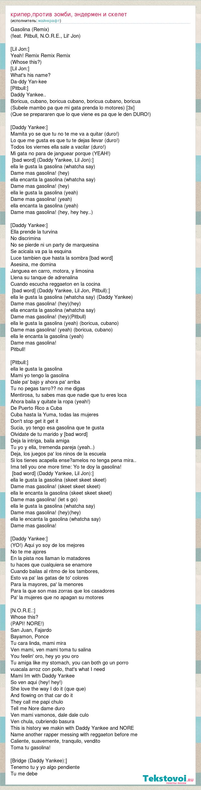 Gasolina (Remix) (feat. Pitbull, N.O.R.E., Lil' Jon) [Lil Jon:] Yeah! Remix Remix Remix (Whose this?) [Lil Jon:] What's his name? Da-ddy Yan-kee [Pitbull:] Daddy Yankee.. Boricua, cubano, boricua cubano, boricua cubano, boricua (Subele mambo pa que mi gata prenda lo motores) [3x] (Que se prepararen que lo que viene es pa que le den DURO!) [Daddy Yankee:] Mamita yo se que tu no te me va a quitar (duro!) Lo que me gusta es que tu te dejas llevar (duro!) Todos los viernes ella sale a vacilar (duro!) Mi gata no para de janguear porque (YEAH!) [Chorus (Daddy Yankee, Lil Jon):] ella le gusta la gasolina (whatcha say) Dame mas gasolina! (hey) ella encanta la gasolina (whatcha say) Dame mas gasolina! (hey) ella le gusta la gasolina (yeah) Dame mas gasolina! (yeah) ella encanta la gasolina (yeah) Dame mas gasolina! (hey, hey hey..) [Daddy Yankee:] Ella prende la turvina No discrimina No se pierde ni un party de marquesina Se acicala va pa la esquina Luce tambien que hasta la sombra le combina Asesina, me domina Janguea en carro, motora, y limosina Llena su tanque de adrenalina Cuando escucha reggaeton en la cocina [Chorus (Daddy Yankee, Lil Jon, Pitbull):] ella le gusta la gasolina (whatcha say) (Daddy Yankee) Dame mas gasolina! (hey)(hey) ella encanta la gasolina (whatcha say) Dame mas gasolina! (hey)(Pitbull) ella le gusta la gasolina (yeah) (boricua, cubano) Dame mas gasolina! (yeah) (boricua, cubano) ella le encanta la gasolina (yeah) Dame mas gasolina! Pitbull! [Pitbull:] ella le gusta la gasolina Mami yo tengo la gasolina Dale pa' bajo y ahora pa' arriba Tu no pegas tarro?? no me digas Mentirosa, tu sabes mas que nadie que tu eres loca Ahora baila y quitate la ropa (yeah!) De Puerto Rico a Cuba Cuba hasta la Yuma, todas las mujeres Don't stop get it get it Sucia, yo tengo esa gasolina que te gusta Olvidate de tu marido y disfruta Deja la intriga, baila amiga Tu yo y ella, tremenda pareja (yeah..) Deja, los juegos pa' los ninos de la escuela Si los tienes acapella ense?amelos no tenga pena mira.. Ima tell you one more time: Yo te doy la gasolina! [Chorus (Daddy Yankee, Lil Jon):] ella le gusta la gasolina (skeet skeet skeet) Dame mas gasolina! (skeet skeet skeet) ella le encanta la gasolina (skeet skeet skeet) Dame mas gasolina! (let s go) ella le gusta la gasolina (whatcha say) Dame mas gasolina! (hey)(hey) ella le encanta la gasolina (whatcha say) Dame mas gasolina! [Daddy Yankee:] (YO!) Aqui yo soy de los mejores No te me ajores En la pista nos llaman lo matadores tu haces que cualquiera se enamore Cuando bailas al ritmo de los tambores, Esto va pa' las gatas de to' colores Para la mayores, pa' la menores Para la que son mas zorras que los casadores Pa' la mujeres que no apagan su motores [N.O.R.E.:] Whose this? (PAPI! NORE!) San Juan, Fajardo Bayamon, Ponce Tu cara linda, mami mira Ven mami, ven mami toma tu salina You feelin' oro, hey yo you oro Tu amiga like my stomach, you can both go un porro vuacala arroz con pollo, that's what I need Mami Im with Daddy Yankee So ven aqui (hey! hey!) She love the way I do it (que que) And flowing on that car do it They call me papi chulo Tell me Nore dame duro Ven mami vamonos, dale dale culo Ven chula, cubriendo basura This is history we makin with Daddy Yankee and NORE Name another rapper messing with reggaeton before me Caliente, suavemente, tranquilo, vendito Toma tu gasolina! [Bridge (Daddy Yankee):] Tenemo tu y yo algo pendiente Tu me debe