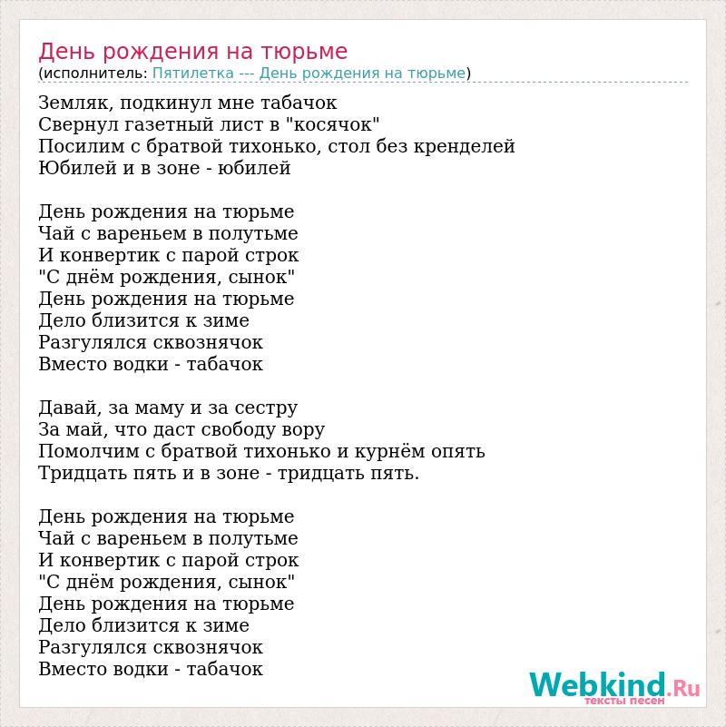 Земляк, подкинул мне табачок Свернул газетный лист в "косячок" Посилим с братвой тихонько, стол без кренделей Юбилей и в зоне - юбилей День рождения на тюрьме Чай с вареньем в полутьме И конвертик с парой строк "С днём рождения, сынок" День рождения на тюрьме Дело близится к зиме Разгулялся сквознячок Вместо водки - табачок Давай, за маму и за сестру За май, что даст свободу вору Помолчим с братвой тихонько и курнём опять Тридцать пять и в зоне - тридцать пять. День рождения на тюрьме Чай с вареньем в полутьме И конвертик с парой строк "С днём рождения, сынок" День рождения на тюрьме Дело близится к зиме Разгулялся сквознячок Вместо водки - табачок