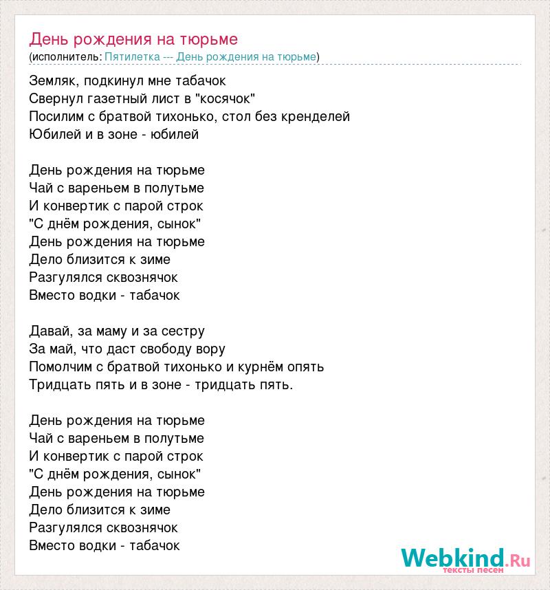 Земляк, подкинул мне табачок Свернул газетный лист в "косячок" Посилим с братвой тихонько, стол без кренделей Юбилей и в зоне - юбилей День рождения на тюрьме Чай с вареньем в полутьме И конвертик с парой строк "С днём рождения, сынок" День рождения на тюрьме Дело близится к зиме Разгулялся сквознячок Вместо водки - табачок Давай, за маму и за сестру За май, что даст свободу вору Помолчим с братвой тихонько и курнём опять Тридцать пять и в зоне - тридцать пять. День рождения на тюрьме Чай с вареньем в полутьме И конвертик с парой строк "С днём рождения, сынок" День рождения на тюрьме Дело близится к зиме Разгулялся сквознячок Вместо водки - табачок