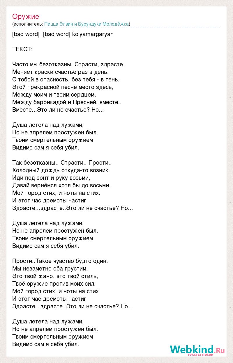 [bad word] [bad word] kolyamargaryan ТЕКСТ: Часто мы безотказны. Страсти, здрасте. Меняет краски счастье раз в день. С тобой в опасность, без тебя - в тень. Этой прекрасной песне место здесь, Между моим и твоим сердцем, Между баррикадой и Пресней, вместе.. Вместе...Это ли не счастье? Но... Душа летела над лужами, Но не апрелем простужен был. Твоим смертельным оружием Видимо сам я себя убил. Так безотказны.. Страсти.. Прости.. Холодный дождь откуда-то возник. Иди под зонт и руку возьми, Давай вернёмся хотя бы до восьми. Мой город стих, и ноты на стих. И этот час дремоты настиг Здрасте...здрасте..Это ли не счастье? Но... Душа летела над лужами, Но не апрелем простужен был. Твоим смертельным оружием Видимо сам я себя убил. Прости..Такое чувство будто один. Мы незаметно оба грустим. Это твой жанр, это твой стиль, Твоё оружие против моих сил. Мой город стих, и ноты на стих И этот час дремоты настиг Здрасте...здрасте..Это ли не счастье? Но... Душа летела над лужами, Но не апрелем простужен был. Твоим смертельным оружием Видимо сам я себя убил.