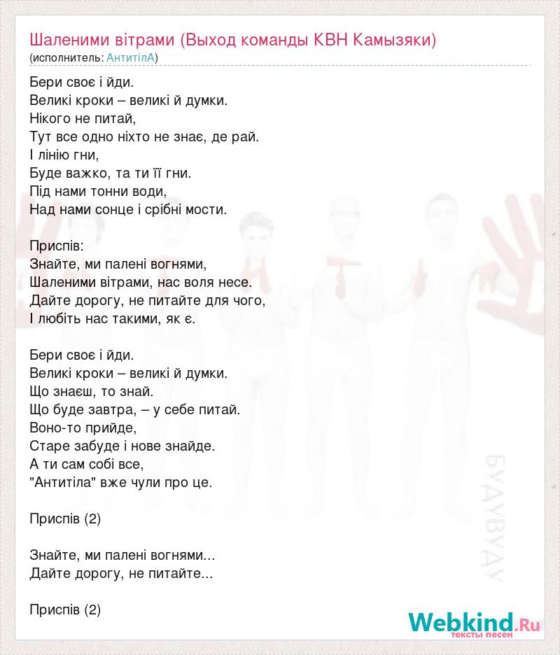 Бери своє і йди. Великі кроки – великі й думки. Нікого не питай, Тут все одно ніхто не знає, де рай. І лінію гни, Буде важко, та ти її гни. Під нами тонни води, Над нами сонце і срібні мости. Приспів: Знайте, ми палені вогнями, Шаленими вітрами, нас воля несе. Дайте дорогу, не питайте для чого, І любіть нас такими, як є. Бери своє і йди. Великі кроки – великі й думки. Що знаєш, то знай. Що буде завтра, – у себе питай. Воно-то прийде, Старе забуде і нове знайде. А ти сам собі все, "Антитіла" вже чули про це. Приспів (2) Знайте, ми палені вогнями... Дайте дорогу, не питайте... Приспів (2)