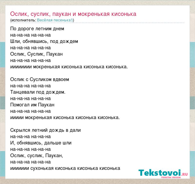 По дороге летним днем на-на-на на-на-на Шли, обнявшись, под дождем на-на-на на-на-на Ослик, Суслик, Паукан на-на-на на-на-на ииииииии мокренькая кисонька кисонька кисонька. Ослик с Сусликом вдвоем на-на-на на-на-на Танцевали под дождем. на-на-на на-на-на Помогал им Паукан на-на-на на-на-на иииии мокренькая кисонька кисонька кисонька. Скрылся летний дождь в дали на-на-на на-на-на И, обнявшись, дальше шли на-на-на на-на-на Ослик, суслик, Паукан, на-на-на на-на-на иииииии сухонькая кисонька кисонька кисонька