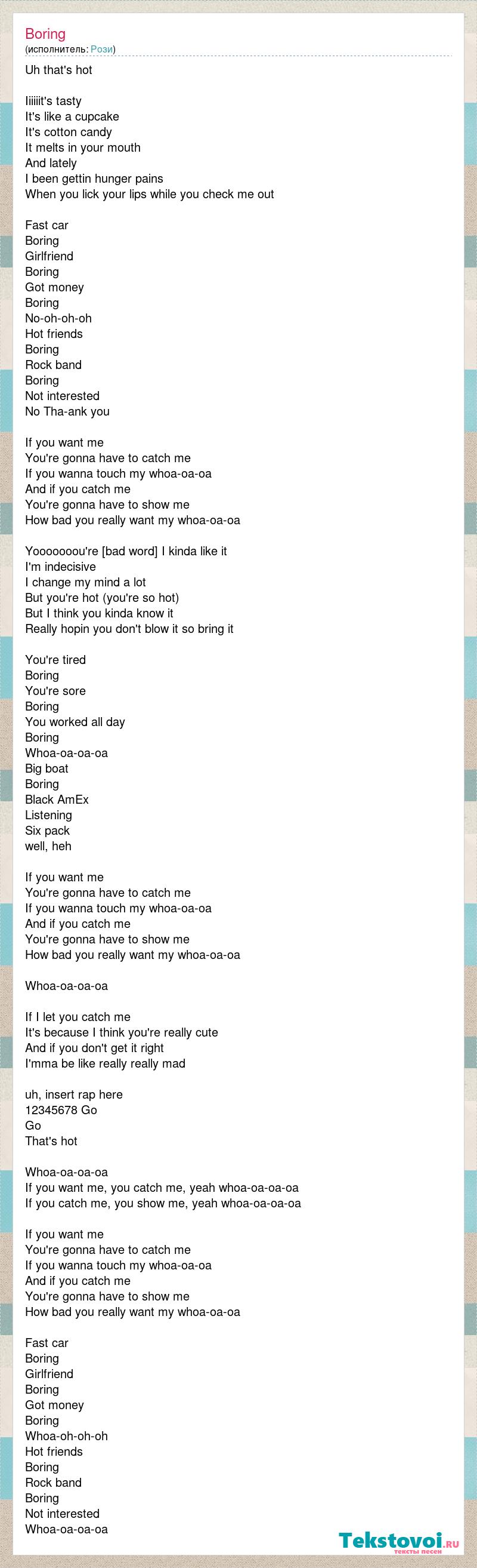Uh that's hot Iiiiiit's tasty It's like a cupcake It's cotton candy It melts in your mouth And lately I been gettin hunger pains When you lick your lips while you check me out Fast car Boring Girlfriend Boring Got money Boring No-oh-oh-oh Hot friends Boring Rock band Boring Not interested No Tha-ank you If you want me You're gonna have to catch me If you wanna touch my whoa-oa-oa And if you catch me You're gonna have to show me How bad you really want my whoa-oa-oa Yooooooou're Scrumptious I kinda like it I'm indecisive I change my mind a lot But you're hot (you're so hot) But I think you kinda know it Really hopin you don't blow it so bring it You're tired Boring You're sore Boring You worked all day Boring Whoa-oa-oa-oa Big boat Boring Black AmEx Listening Six pack well, heh If you want me You're gonna have to catch me If you wanna touch my whoa-oa-oa And if you catch me You're gonna have to show me How bad you really want my whoa-oa-oa Whoa-oa-oa-oa If I let you catch me It's because I think you're really cute And if you don't get it right I'mma be like really really mad uh, insert rap here 12345678 Go Go That's hot Whoa-oa-oa-oa If you want me, you catch me, yeah whoa-oa-oa-oa If you catch me, you show me, yeah whoa-oa-oa-oa If you want me You're gonna have to catch me If you wanna touch my whoa-oa-oa And if you catch me You're gonna have to show me How bad you really want my whoa-oa-oa Fast car Boring Girlfriend Boring Got money Boring Whoa-oh-oh-oh Hot friends Boring Rock band Boring Not interested Whoa-oa-oa-oa