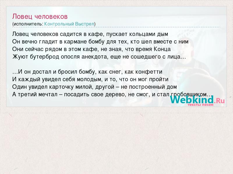 Ловец человеков садится в кафе, пускает кольцами дым Он вечно гладит в кармане бомбу для тех, кто шел вместе с ним Они сейчас рядом в этом кафе, не зная, что время Конца Жуют бутерброд опосля анекдота, еще не сошедшего с лица… …И он достал и бросил бомбу, как снег, как конфетти И каждый увидел себя молодым, и то, что он мог пройти Один увидел карточку милой, другой – не построенный дом А третий мечтал – посадить свое дерево, не смог, и стал гробовщиком…