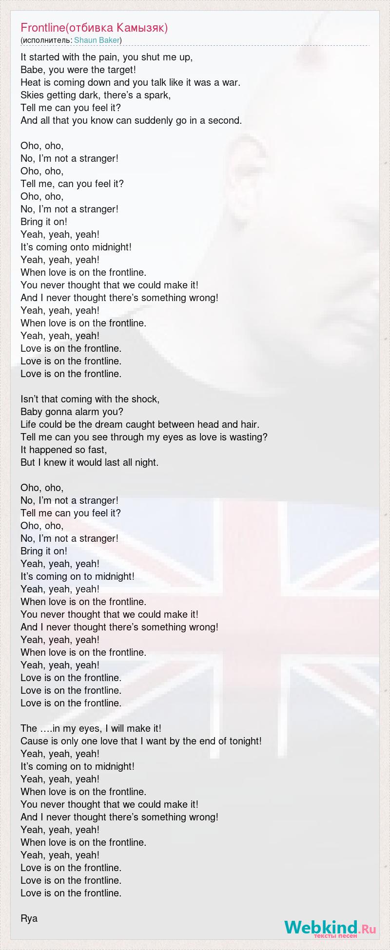 It started with the pain, you shut me up, Babe, you were the target! Heat is coming down and you talk like it was a war. Skies getting dark, there’s a spark, Tell me can you feel it? And all that you know can suddenly go in a second. Oho, oho, No, I’m not a stranger! Oho, oho, Tell me, can you feel it? Oho, oho, No, I’m not a stranger! Bring it on! Yeah, yeah, yeah! It’s coming onto midnight! Yeah, yeah, yeah! When love is on the frontline. You never thought that we could make it! And I never thought there’s something wrong! Yeah, yeah, yeah! When love is on the frontline. Yeah, yeah, yeah! Love is on the frontline. Love is on the frontline. Love is on the frontline. Isn’t that coming with the shock, Baby gonna alarm you? Life could be the dream caught between head and hair. Tell me can you see through my eyes as love is wasting? It happened so fast, But I knew it would last all night. Oho, oho, No, I’m not a stranger! Tell me can you feel it? Oho, oho, No, I’m not a stranger! Bring it on! Yeah, yeah, yeah! It’s coming on to midnight! Yeah, yeah, yeah! When love is on the frontline. You never thought that we could make it! And I never thought there’s something wrong! Yeah, yeah, yeah! When love is on the frontline. Yeah, yeah, yeah! Love is on the frontline. Love is on the frontline. Love is on the frontline. The ….in my eyes, I will make it! Cause is only one love that I want by the end of tonight! Yeah, yeah, yeah! It’s coming on to midnight! Yeah, yeah, yeah! When love is on the frontline. You never thought that we could make it! And I never thought there’s something wrong! Yeah, yeah, yeah! When love is on the frontline. Yeah, yeah, yeah! Love is on the frontline. Love is on the frontline. Love is on the frontline. Rya