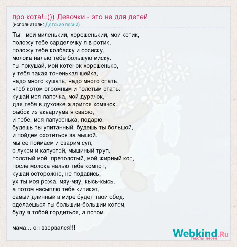 Ты - мой миленький, хорошенький, мой котик, положу тебе сарделечку я в ротик, положу тебе колбаску и сосиску, молока налью тебе большую миску. ты покушай, мой котенок хорошенько, у тебя такая тоненькая шейка, надо много кушать, надо много спать, чтоб котом огромным и толстым стать. кушай моя лапочка, мой дурачок, для тебя в духовке жарится хомячок. рыбок из аквариума я сварю, и тебе, моя лапусенька, подарю. будешь ты упитанный, будешь ты большой, и пойдем охотиться за мышой. мы ее поймаем и сварим суп, с луком и капустой, мышиный труп. толстый мой, претолстый, мой жирный кот, после молока налью тебе компот, кушай осторожно, не подавись, ух ты моя рожа, мяу-мяу, кысь-кысь. а потом насыплю тебе китикэт, самый длинный в мире будет твой обед. сделаешься ты большим-большим котом, буду я тобой гордиться, а потом... мама... он взорвался!!!