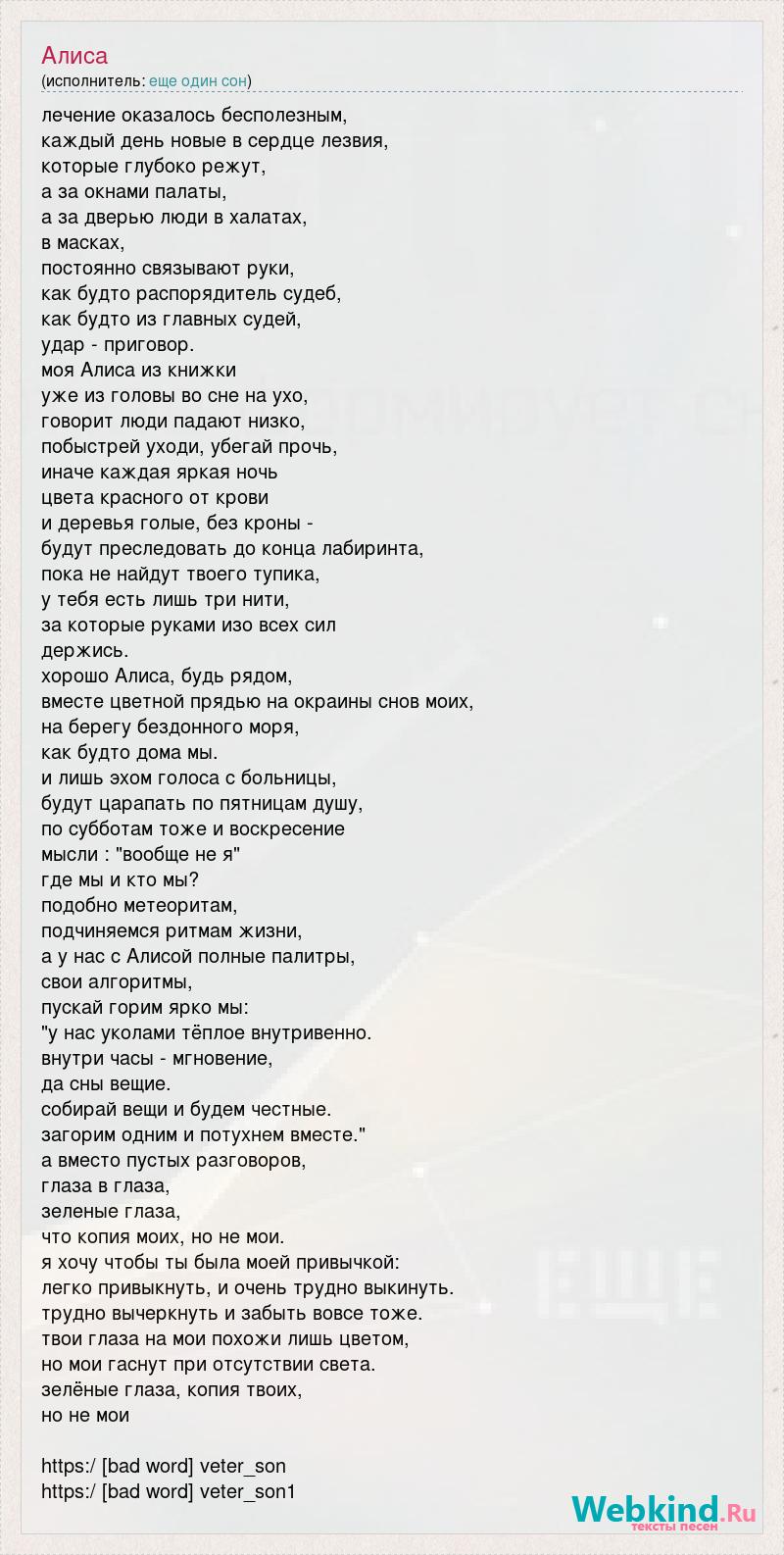 лечение оказалось бесполезным, каждый день новые в сердце лезвия, которые глубоко режут, а за окнами палаты, а за дверью люди в халатах, в масках, постоянно связывают руки, как будто распорядитель судеб, как будто из главных судей, удар - приговор. моя Алиса из книжки уже из головы во сне на ухо, говорит люди падают низко, побыстрей уходи, убегай прочь, иначе каждая яркая ночь цвета красного от крови и деревья голые, без кроны - будут преследовать до конца лабиринта, пока не найдут твоего тупика, у тебя есть лишь три нити, за которые руками изо всех сил держись. хорошо Алиса, будь рядом, вместе цветной прядью на окраины снов моих, на берегу бездонного моря, как будто дома мы. и лишь эхом голоса с больницы, будут царапать по пятницам душу, по субботам тоже и воскресение мысли : "вообще не я" где мы и кто мы? подобно метеоритам, подчиняемся ритмам жизни, а у нас с Алисой полные палитры, свои алгоритмы, пускай горим ярко мы: "у нас уколами тёплое внутривенно. внутри часы - мгновение, да сны вещие. собирай вещи и будем честные. загорим одним и потухнем вместе." а вместо пустых разговоров, глаза в глаза, зеленые глаза, что копия моих, но не мои. я хочу чтобы ты была моей привычкой: легко привыкнуть, и очень трудно выкинуть. трудно вычеркнуть и забыть вовсе тоже. твои глаза на мои похожи лишь цветом, но мои гаснут при отсутствии света. зелёные глаза, копия твоих, но не мои https:/ [bad word] veter_son https:/ [bad word] veter_son1
