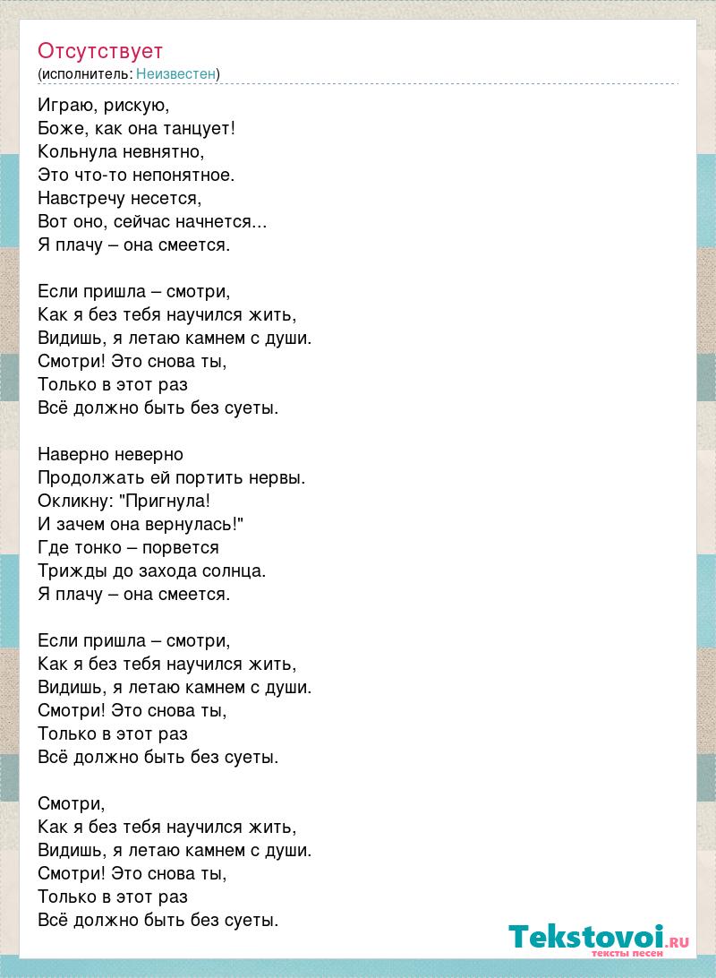 Играю, рискую, Боже, как она танцует! Кольнула невнятно, Это что-то непонятное. Навстречу несется, Вот оно, сейчас начнется... Я плачу – она смеется. Если пришла – смотри, Как я без тебя научился жить, Видишь, я летаю камнем с души. Смотри! Это снова ты, Только в этот раз Всё должно быть без суеты. Наверно неверно Продолжать ей портить нервы. Окликну: "Пригнула! И зачем она вернулась!" Где тонко – порвется Трижды до захода солнца. Я плачу – она смеется. Если пришла – смотри, Как я без тебя научился жить, Видишь, я летаю камнем с души. Смотри! Это снова ты, Только в этот раз Всё должно быть без суеты. Смотри, Как я без тебя научился жить, Видишь, я летаю камнем с души. Смотри! Это снова ты, Только в этот раз Всё должно быть без суеты.
