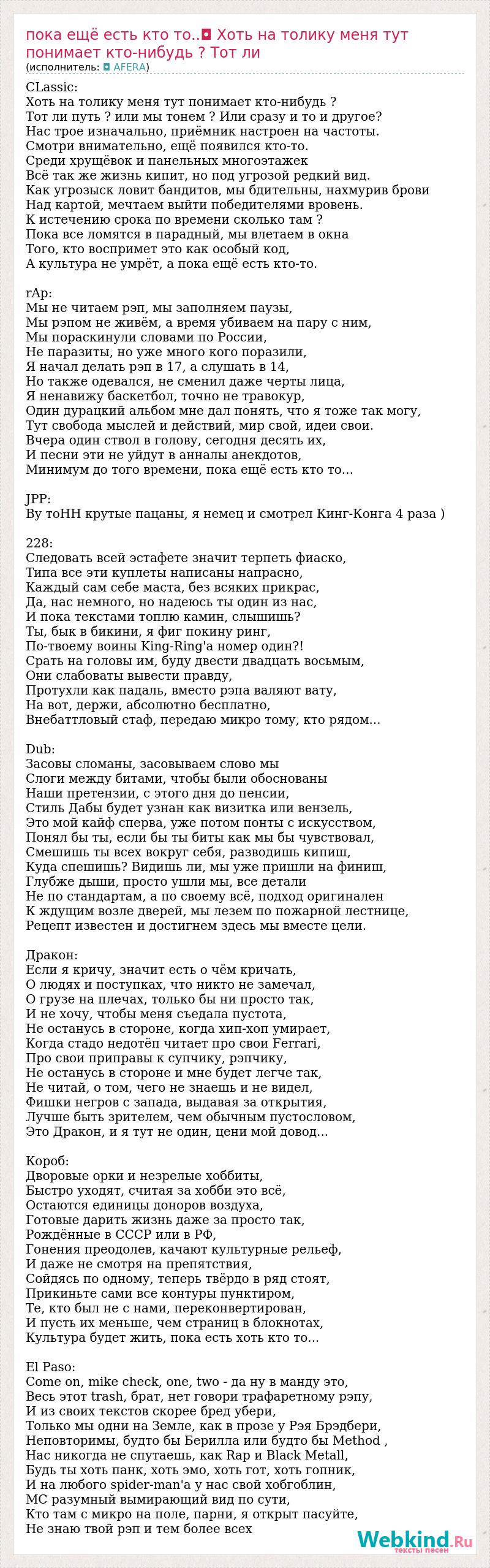 CLassic: Хоть на толику меня тут понимает кто-нибудь ? Тот ли путь ? или мы тонем ? Или сразу и то и другое? Нас трое изначально, приёмник настроен на частоты. Смотри внимательно, ещё появился кто-то. Среди хрущёвок и панельных многоэтажек Всё так же жизнь кипит, но под угрозой редкий вид. Как угрозыск ловит бандитов, мы бдительны, нахмурив брови Над картой, мечтаем выйти победителями вровень. К истечению срока по времени сколько там ? Пока все ломятся в парадный, мы влетаем в окна Того, кто воспримет это как особый код, А культура не умрёт, а пока ещё есть кто-то. rAp: Мы не читаем рэп, мы заполняем паузы, Мы рэпом не живём, а время убиваем на пару с ним, Мы пораскинули словами по России, Не паразиты, но уже много кого поразили, Я начал делать рэп в 17, а слушать в 14, Но также одевался, не сменил даже черты лица, Я ненавижу баскетбол, точно не травокур, Один дурацкий альбом мне дал понять, что я тоже так могу, Тут свобода мыслей и действий, мир свой, идеи свои. Вчера один ствол в голову, сегодня десять их, И песни эти не уйдут в анналы анекдотов, Минимум до того времени, пока ещё есть кто то... JPP: Ву тоНН крутые пацаны, я немец и смотрел Кинг-Конга 4 раза ) 228: Следовать всей эстафете значит терпеть фиаско, Типа все эти куплеты написаны напрасно, Каждый сам себе маста, без всяких прикрас, Да, нас немного, но надеюсь ты один из нас, И пока текстами топлю камин, слышишь? Ты, бык в бикини, я фиг покину ринг, По-твоему воины King-Ring'а номер один?! Срать на головы им, буду двести двадцать восьмым, Они слабоваты вывести правду, Протухли как падаль, вместо рэпа валяют вату, На вот, держи, абсолютно бесплатно, Внебаттловый стаф, передаю микро тому, кто рядом... Dub: Засовы сломаны, засовываем слово мы Слоги между битами, чтобы были обоснованы Наши претензии, с этого дня до пенсии, Стиль Дабы будет узнан как визитка или вензель, Это мой кайф сперва, уже потом понты с искусством, Понял бы ты, если бы ты биты как мы бы чувствовал, Смешишь ты всех вокруг себя, разводишь кипиш, Куда спешишь? Видишь ли, мы уже пришли на финиш, Глубже дыши, просто ушли мы, все детали Не по стандартам, а по своему всё, подход оригинален К ждущим возле дверей, мы лезем по пожарной лестнице, Рецепт известен и достигнем здесь мы вместе цели. Дракон: Если я кричу, значит есть о чём кричать, О людях и поступках, что никто не замечал, О грузе на плечах, только бы ни просто так, И не хочу, чтобы меня съедала пустота, Не останусь в стороне, когда хип-хоп умирает, Когда стадо недотёп читает про свои Ferrari, Про свои приправы к супчику, рэпчику, Не останусь в стороне и мне будет легче так, Не читай, о том, чего не знаешь и не видел, Фишки негров с запада, выдавая за открытия, Лучше быть зрителем, чем обычным пустословом, Это Дракон, и я тут не один, цени мой довод... Короб: Дворовые орки и незрелые хоббиты, Быстро уходят, считая за хобби это всё, Остаются единицы доноров воздуха, Готовые дарить жизнь даже за просто так, Рождённые в СССР или в РФ, Гонения преодолев, качают культурные рельеф, И даже не смотря на препятствия, Сойдясь по одному, теперь твёрдо в ряд стоят, Прикиньте сами все контуры пунктиром, Те, кто был не с нами, переконвертирован, И пусть их меньше, чем страниц в блокнотах, Культура будет жить, пока есть хоть кто то... El Paso: Come on, mike check, one, two - да ну в манду это, Весь этот trash, брат, нет говори трафаретному рэпу, И из своих текстов скорее бред убери, Т