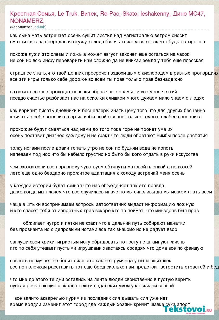Главная→Исполнители→D-tab→Крестная Семья, Le Truk, Витек, Re-Pac, Skato, leshakenny, Дино MC47, NONAME