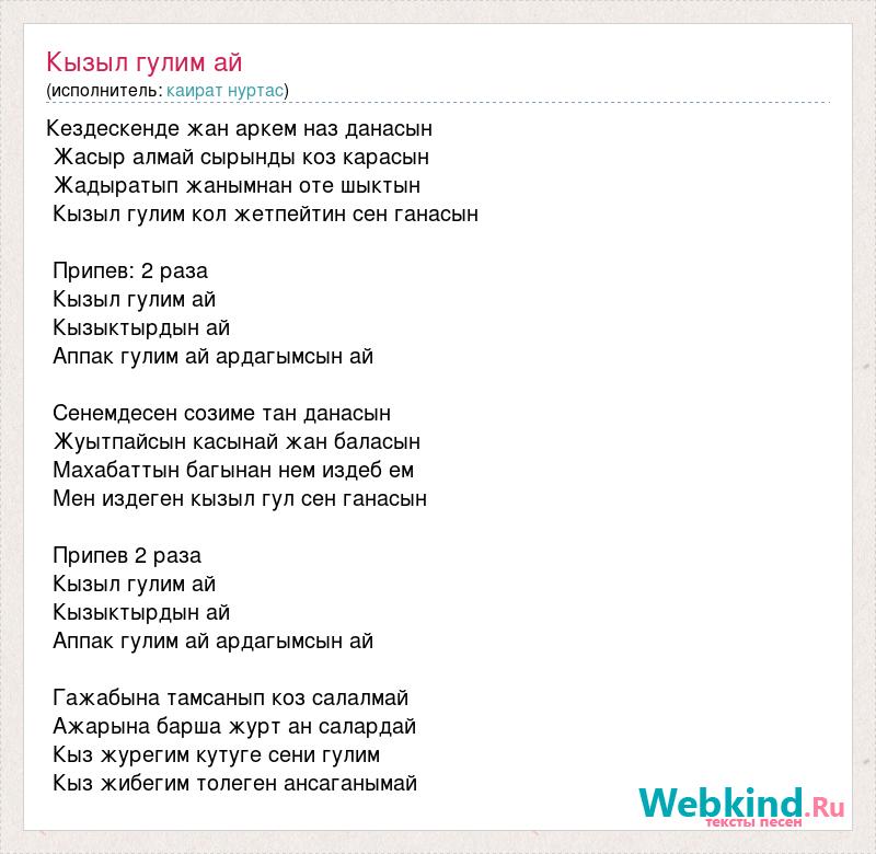 Кездескенде жан аркем наз данасын Жасыр алмай сырынды коз карасын Жадыратып жанымнан оте шыктын Кызыл гулим кол жетпейтин сен ганасын Припев: 2 раза Кызыл гулим ай Кызыктырдын ай Аппак гулим ай ардагымсын ай Сенемдесен созиме тан данасын Жуытпайсын касынай жан баласын Махабаттын багынан нем издеб ем Мен издеген кызыл гул сен ганасын Припев 2 раза Кызыл гулим ай Кызыктырдын ай Аппак гулим ай ардагымсын ай Гажабына тамсанып коз салалмай Ажарына барша журт ан салардай Кыз журегим кутуге сени гулим Кыз жибегим толеген ансаганымай